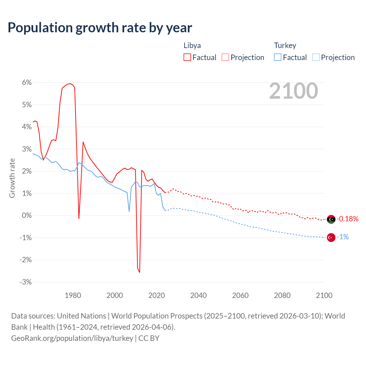 - For the last 10 years, Libya has had an average growth rate of +1.44% per year vs +1.06% in Turkey.