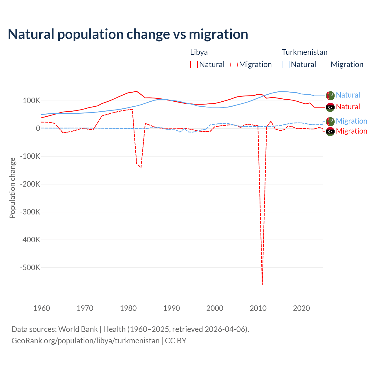 Over the last 10 years, 99.4% of the population change in Libya is from natural causes (a gain of 975,799 people) and 0.63% is from migration (a loss of 6,150 people). In Turkmenistan 89.2% is from natural causes (a gain of 1,270,228 people) and 10.8% is from migration (a gain of 154,379 people).