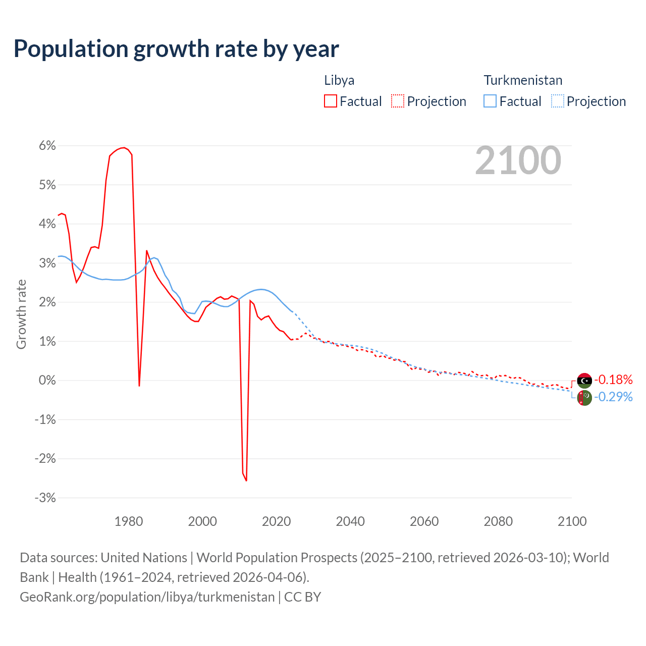 - For the last 10 years, Libya has had an average growth rate of +1.44% per year vs +2.14% in Turkmenistan.