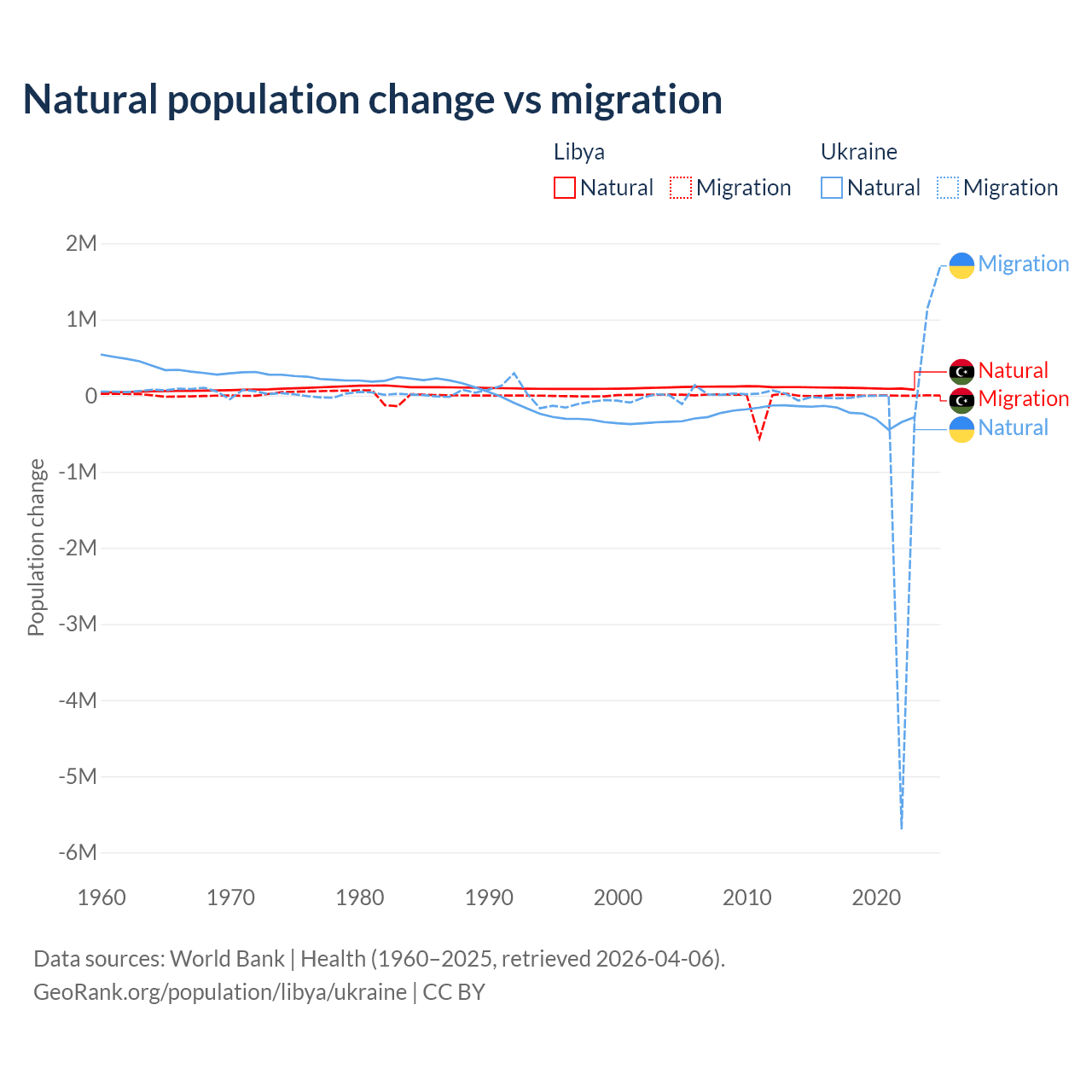 Over the last 10 years, 99.4% of the population change in Libya is from natural causes (a gain of 975,799 people) and 0.63% is from migration (a loss of 6,150 people). In Ukraine 28.2% is from natural causes (a loss of 2,435,153 people) and 71.8% is from migration (a loss of 6,198,995 people).