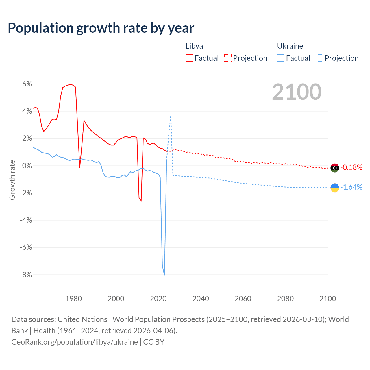 - For the last 10 years, Libya has had an average growth rate of +1.44% per year vs -1.74% in Ukraine.