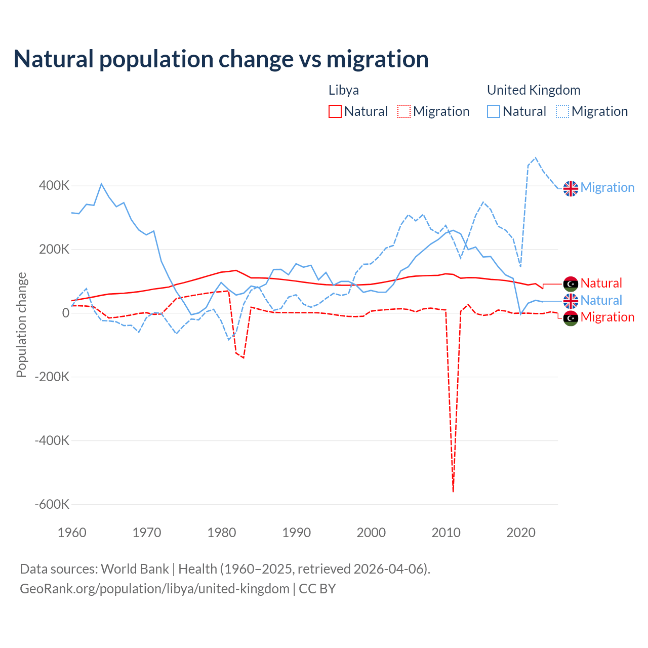 Over the last 10 years, 99.4% of the population change in Libya is from natural causes (a gain of 975,799 people) and 0.63% is from migration (a loss of 6,150 people). In the United Kingdom 23.9% is from natural causes (a gain of 1,033,129 people) and 76.1% is from migration (a gain of 3,283,101 people).