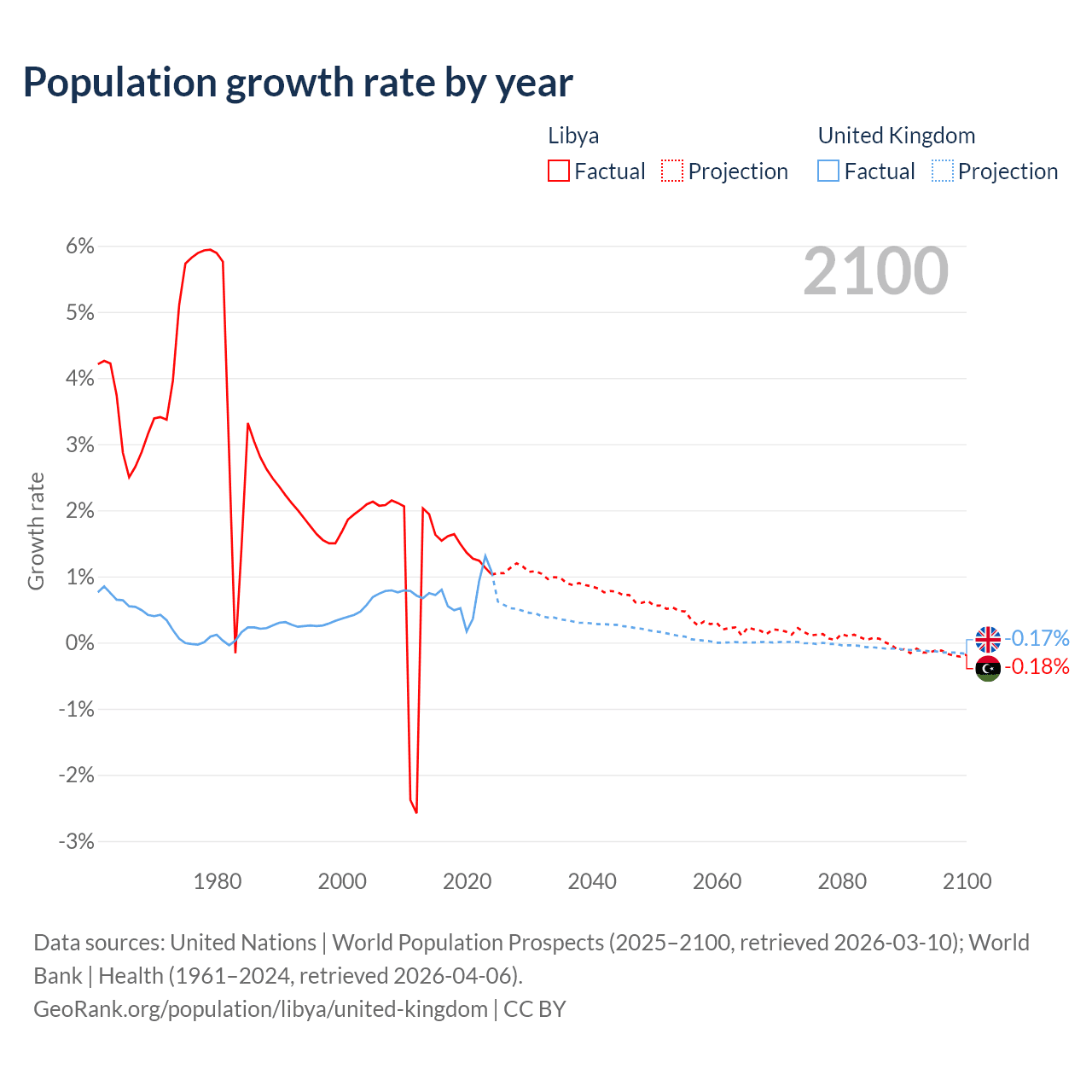 - For the last 10 years, Libya has had an average growth rate of +1.44% per year vs +0.7% in the United Kingdom.