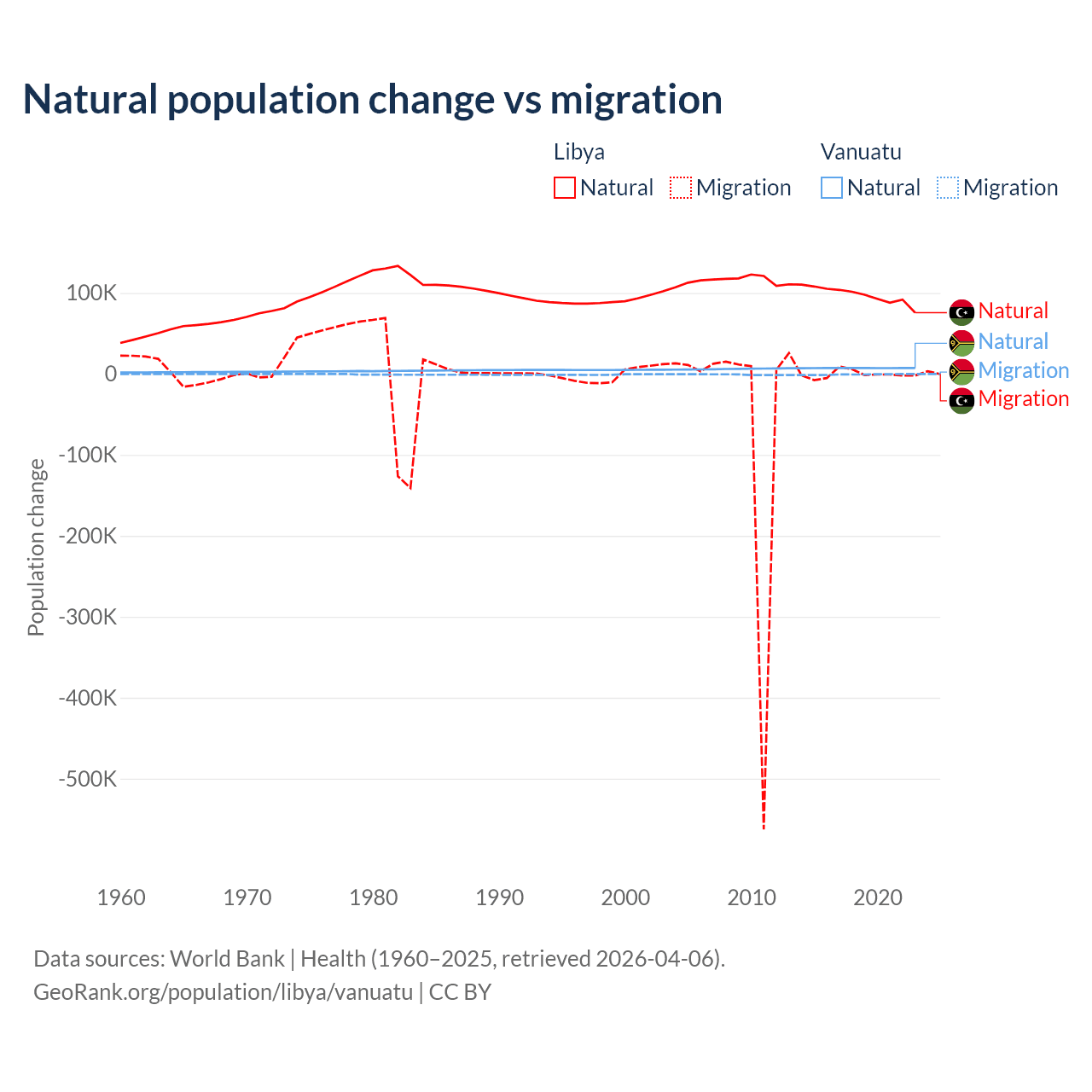 Over the last 10 years, 99.4% of the population change in Libya is from natural causes (a gain of 975,799 people) and 0.63% is from migration (a loss of 6,150 people). In Vanuatu 92.2% is from natural causes (a gain of 72,941 people) and 7.81% is from migration (a loss of 6,181 people).