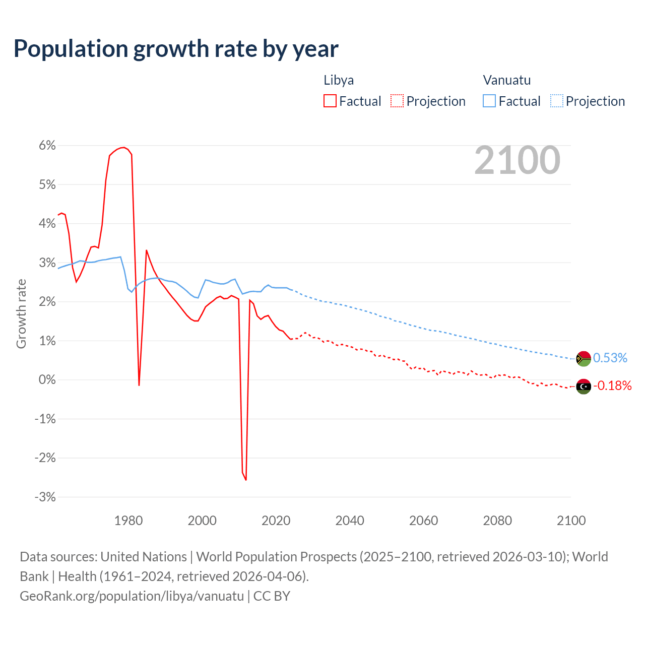 - For the last 10 years, Libya has had an average growth rate of +1.44% per year vs +2.33% in Vanuatu.