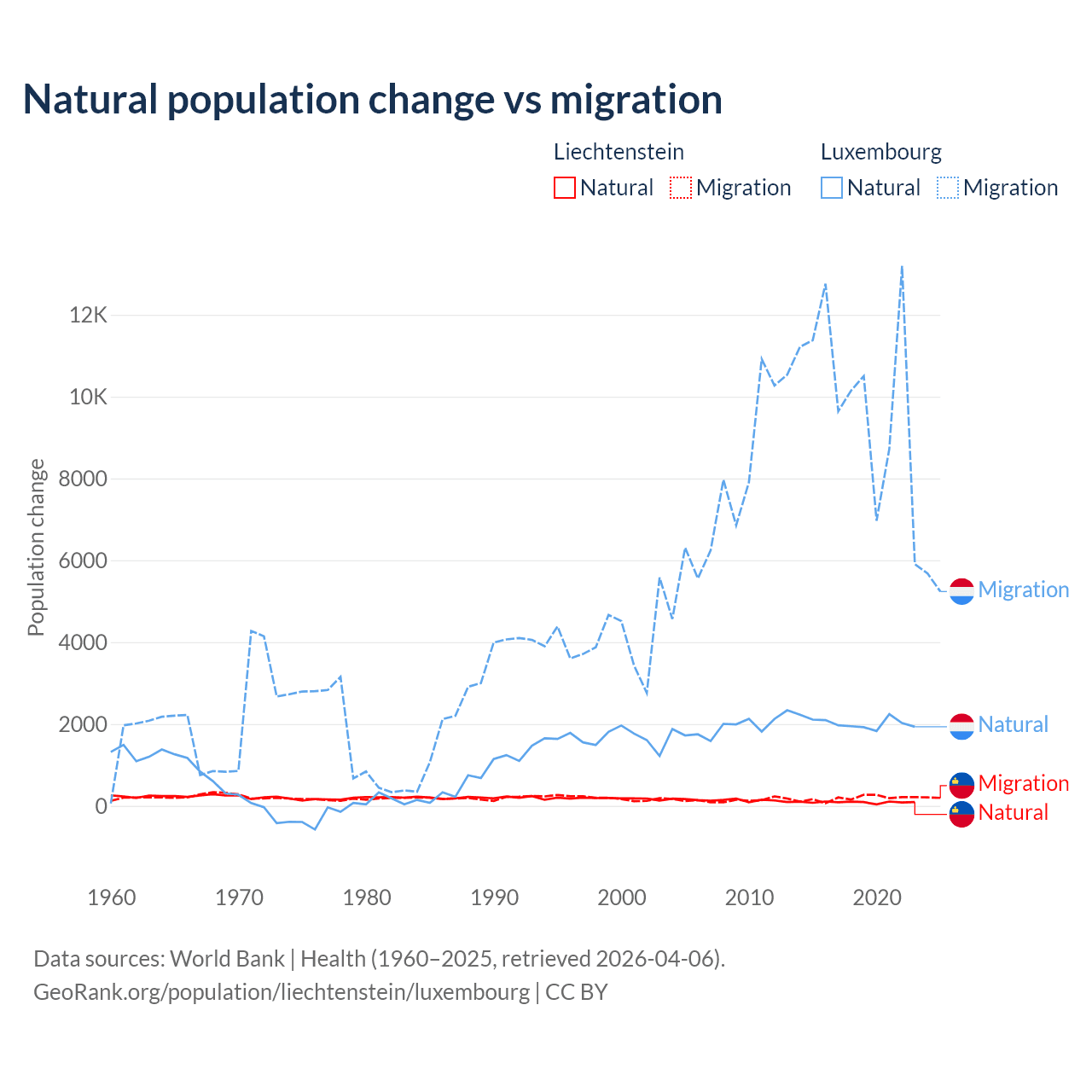 Over the last 10 years, 32.4% of the population change in Liechtenstein is from natural causes (a gain of 883 people) and 67.6% is from migration (a gain of 1,843 people). In Luxembourg 16.8% is from natural causes (a gain of 20,287 people) and 83.2% is from migration (a gain of 100,435 people).