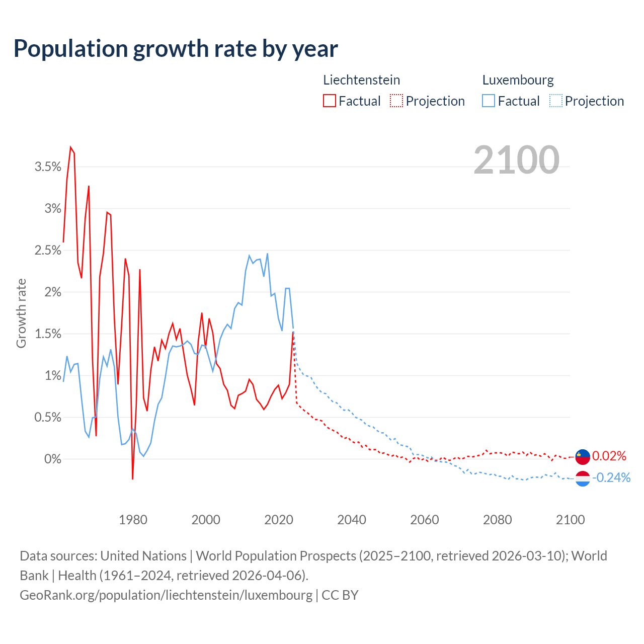- For the last 10 years, Liechtenstein has had an average growth rate of +0.82% per year vs +2.02% in Luxembourg.
