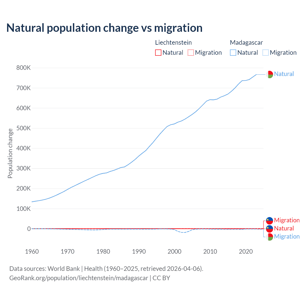 Over the last 10 years, 32.4% of the population change in Liechtenstein is from natural causes (a gain of 883 people) and 67.6% is from migration (a gain of 1,843 people). In Madagascar 99.7% is from natural causes (a gain of 7,165,578 people) and 0.31% is from migration (a loss of 22,384 people).