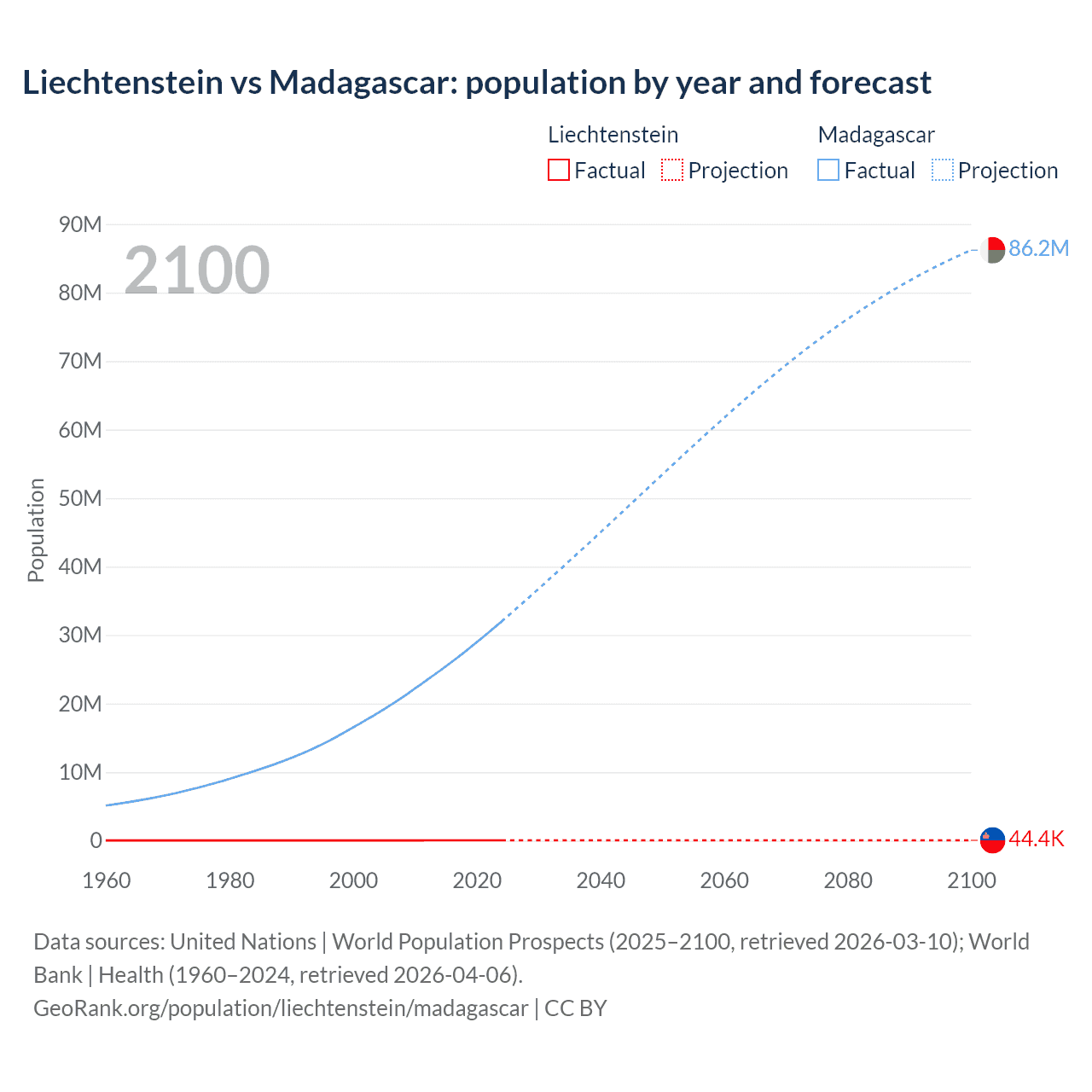 Liechtenstein vs Madagascar: population by year and forecast