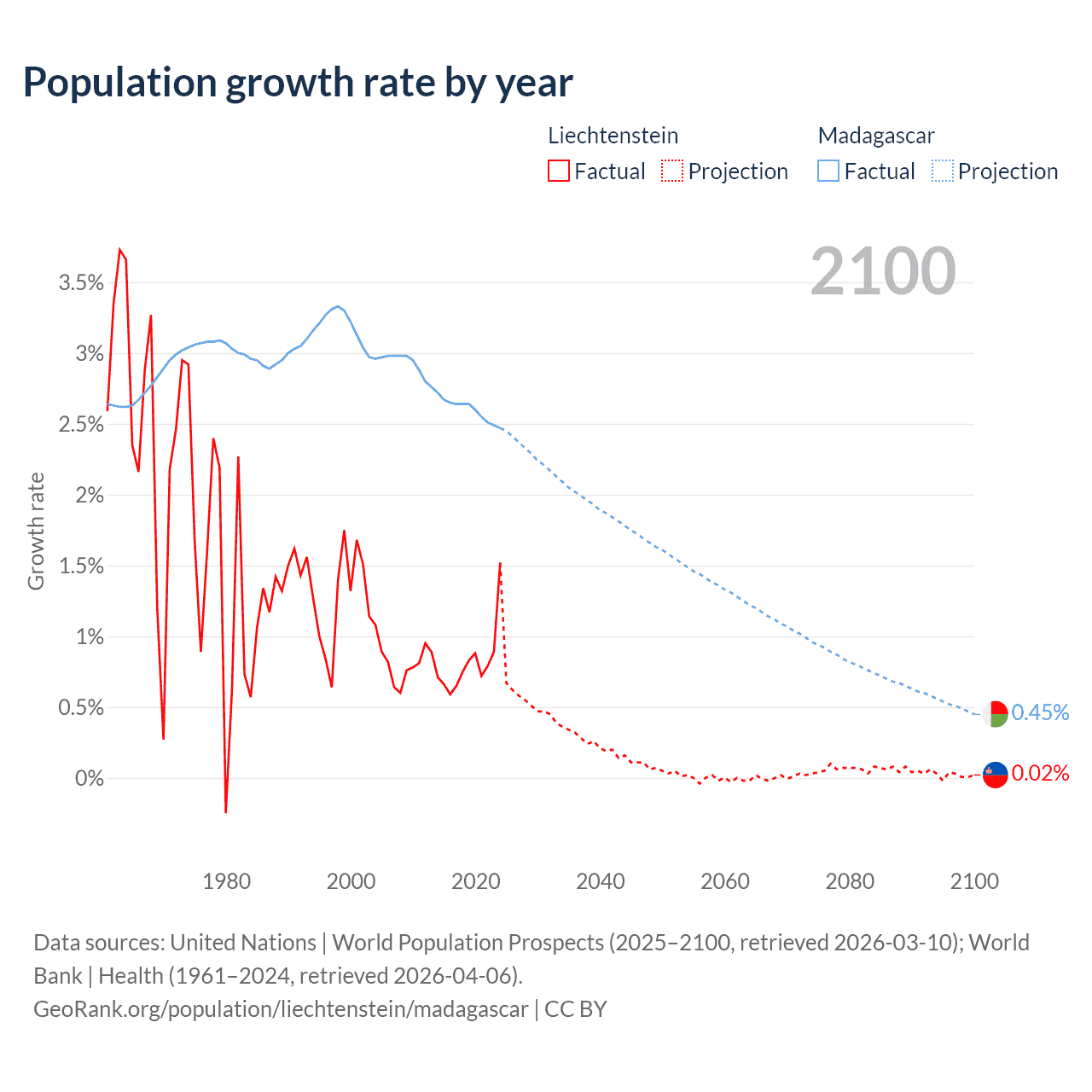 - For the last 10 years, Liechtenstein has had an average growth rate of +0.82% per year vs +2.6% in Madagascar.