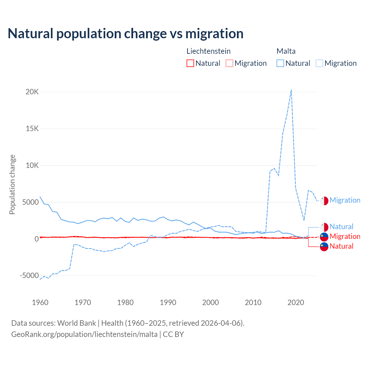 Over the last 10 years, 32.4% of the population change in Liechtenstein is from natural causes (a gain of 883 people) and 67.6% is from migration (a gain of 1,843 people). In Malta 5.84% is from natural causes (a gain of 6,181 people) and 94.2% is from migration (a gain of 99,652 people).