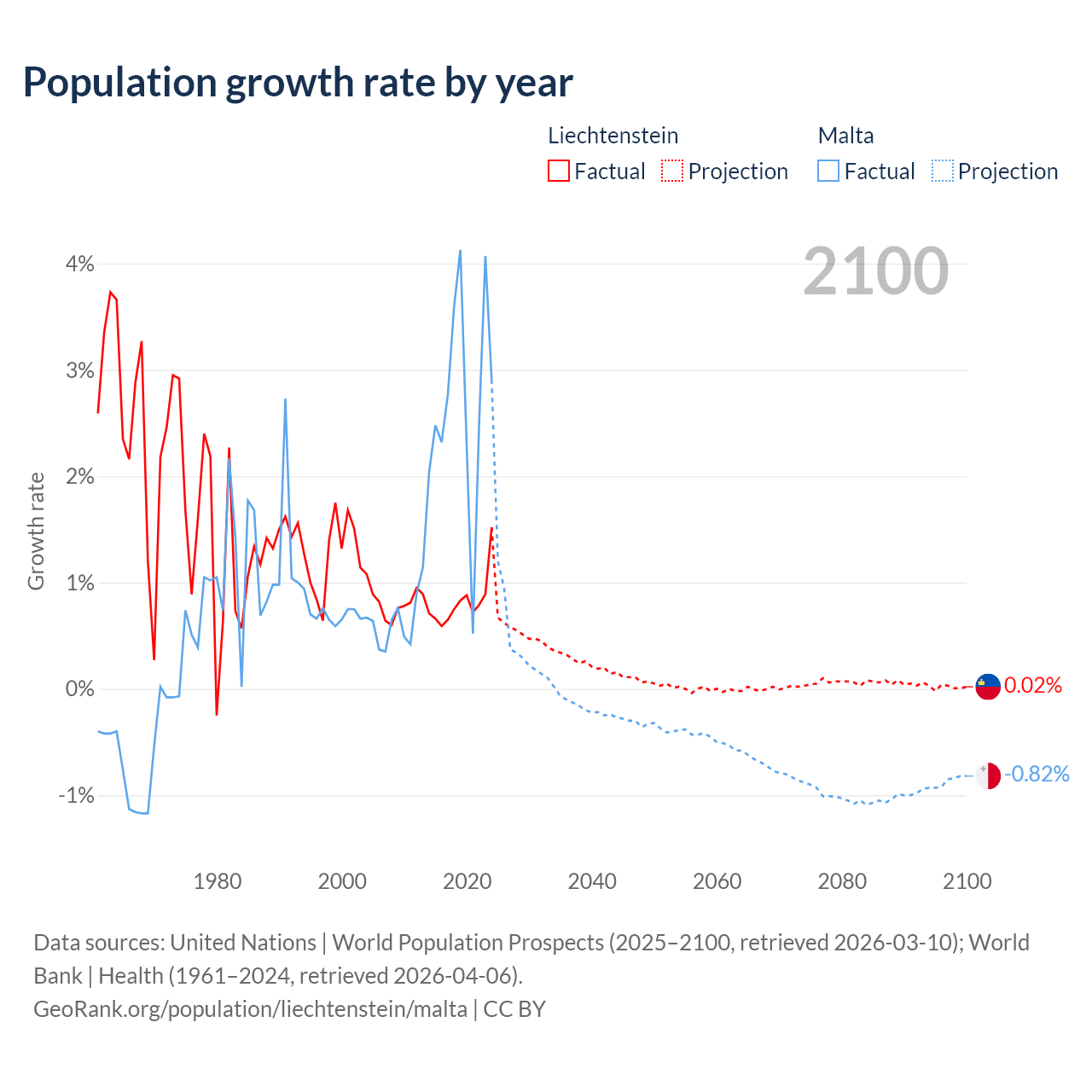 - For the last 10 years, Liechtenstein has had an average growth rate of +0.82% per year vs +2.69% in Malta.