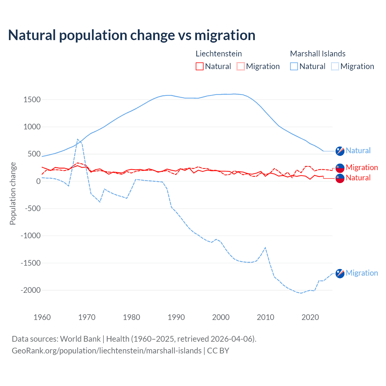 Over the last 10 years, 32.4% of the population change in Liechtenstein is from natural causes (a gain of 883 people) and 67.6% is from migration (a gain of 1,843 people). In the Marshall Islands 27.8% is from natural causes (a gain of 7,592 people) and 72.2% is from migration (a loss of 19,682 people).
