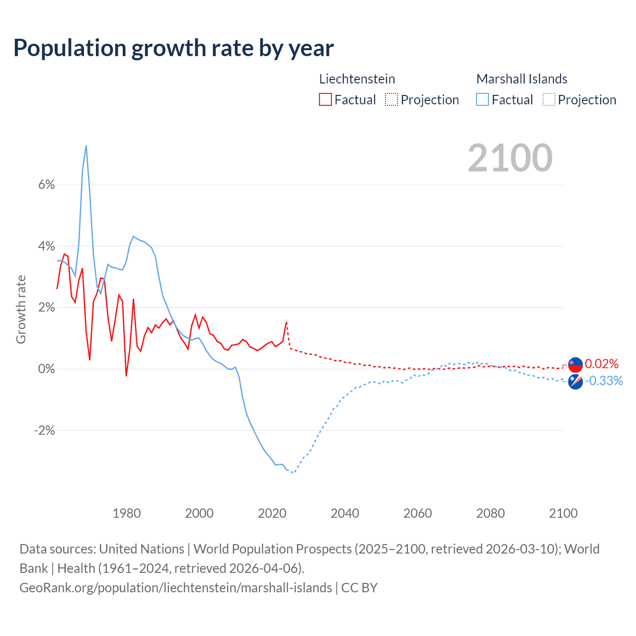- Since 2006, the population of Liechtenstein has increased from 35K people to 41K (17.1% growth), while the Marshall Islands has declined from 52K to 35.1K (32.6% decline).