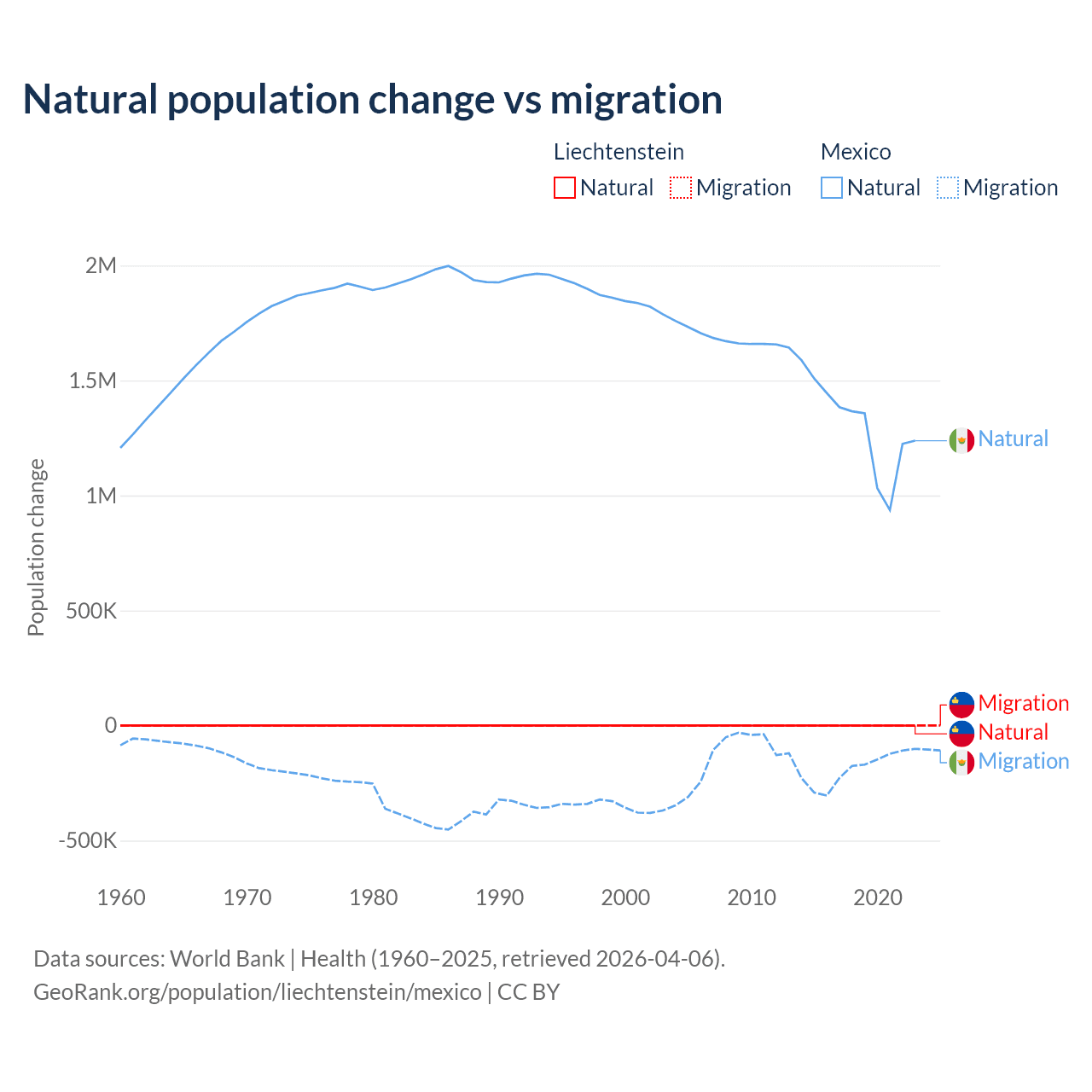 Over the last 10 years, 32.4% of the population change in Liechtenstein is from natural causes (a gain of 883 people) and 67.6% is from migration (a gain of 1,843 people). In Mexico 87.5% is from natural causes (a gain of 13,080,136 people) and 12.5% is from migration (a loss of 1,876,544 people).