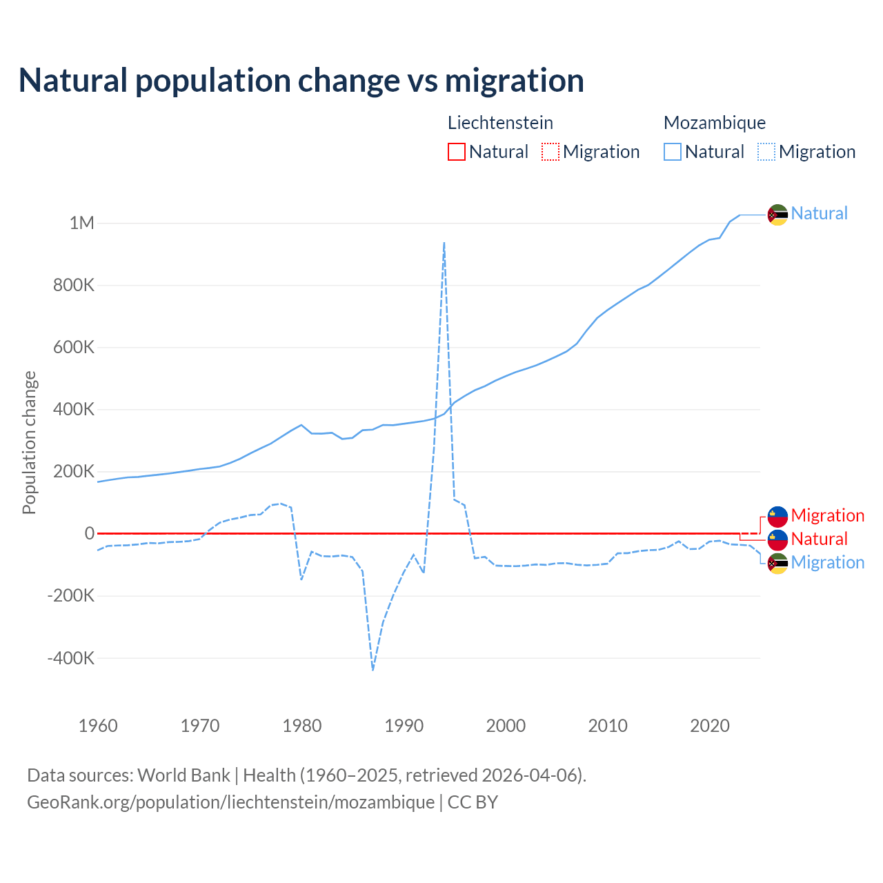 Over the last 10 years, 32.4% of the population change in Liechtenstein is from natural causes (a gain of 883 people) and 67.6% is from migration (a gain of 1,843 people). In Mozambique 95.9% is from natural causes (a gain of 9,108,203 people) and 4.15% is from migration (a loss of 393,923 people).