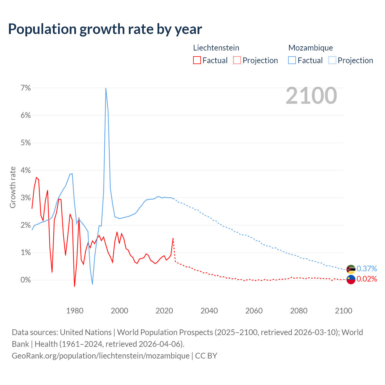 - For the last 10 years, Liechtenstein has had an average growth rate of +0.82% per year vs +2.99% in Mozambique.