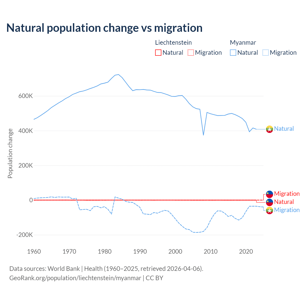 Over the last 10 years, 32.4% of the population change in Liechtenstein is from natural causes (a gain of 883 people) and 67.6% is from migration (a gain of 1,843 people). In Myanmar 86% is from natural causes (a gain of 4,594,615 people) and 14% is from migration (a loss of 749,272 people).