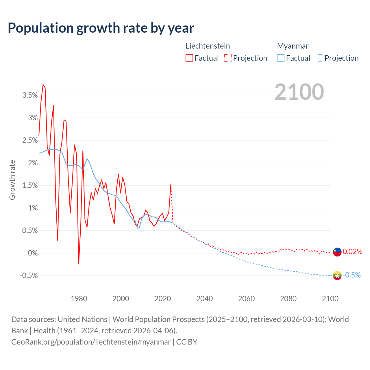 - For the last 10 years, Liechtenstein has had an average growth rate of +0.82% per year vs +0.74% in Myanmar.
