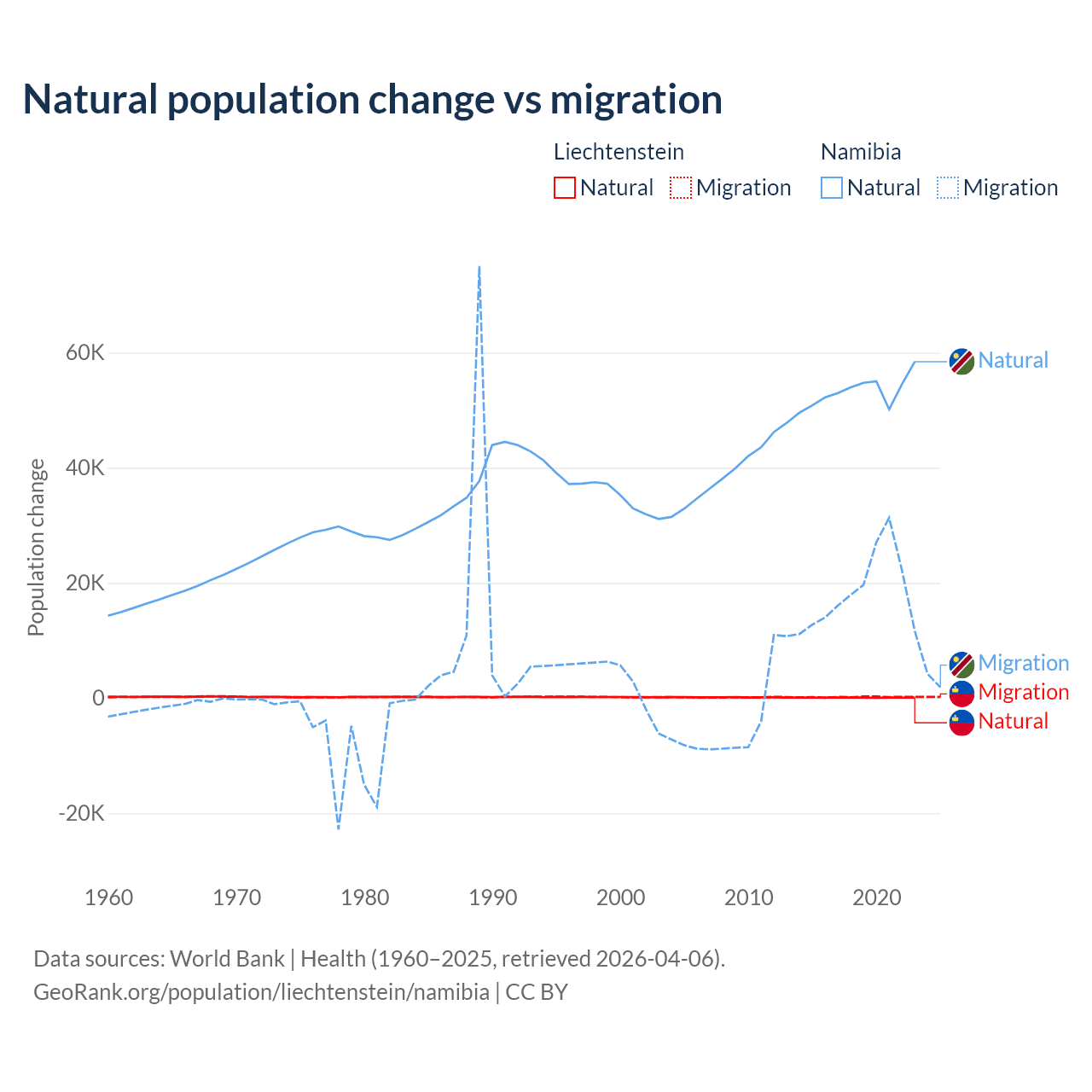 Over the last 10 years, 32.4% of the population change in Liechtenstein is from natural causes (a gain of 883 people) and 67.6% is from migration (a gain of 1,843 people). In Namibia 74.3% is from natural causes (a gain of 532,532 people) and 25.7% is from migration (a gain of 183,837 people).
