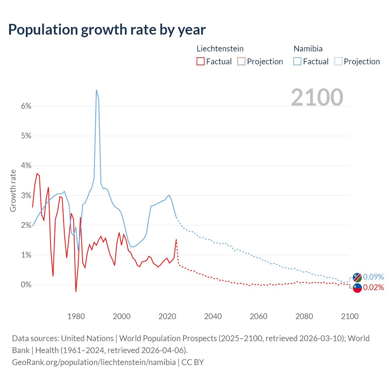 - For the last 10 years, Liechtenstein has had an average growth rate of +0.82% per year vs +2.73% in Namibia.
