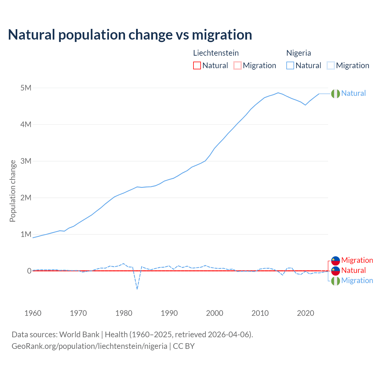 Over the last 10 years, 32.4% of the population change in Liechtenstein is from natural causes (a gain of 883 people) and 67.6% is from migration (a gain of 1,843 people). In Nigeria 99.2% is from natural causes (a gain of 47,163,517 people) and 0.77% is from migration (a loss of 368,103 people).