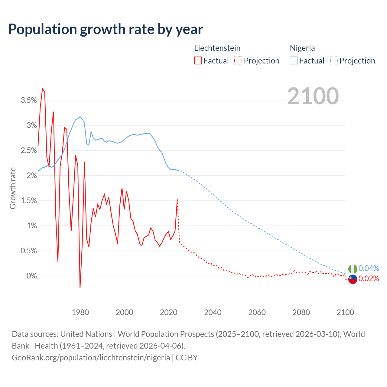 - For the last 10 years, Liechtenstein has had an average growth rate of +0.82% per year vs +2.31% in Nigeria.