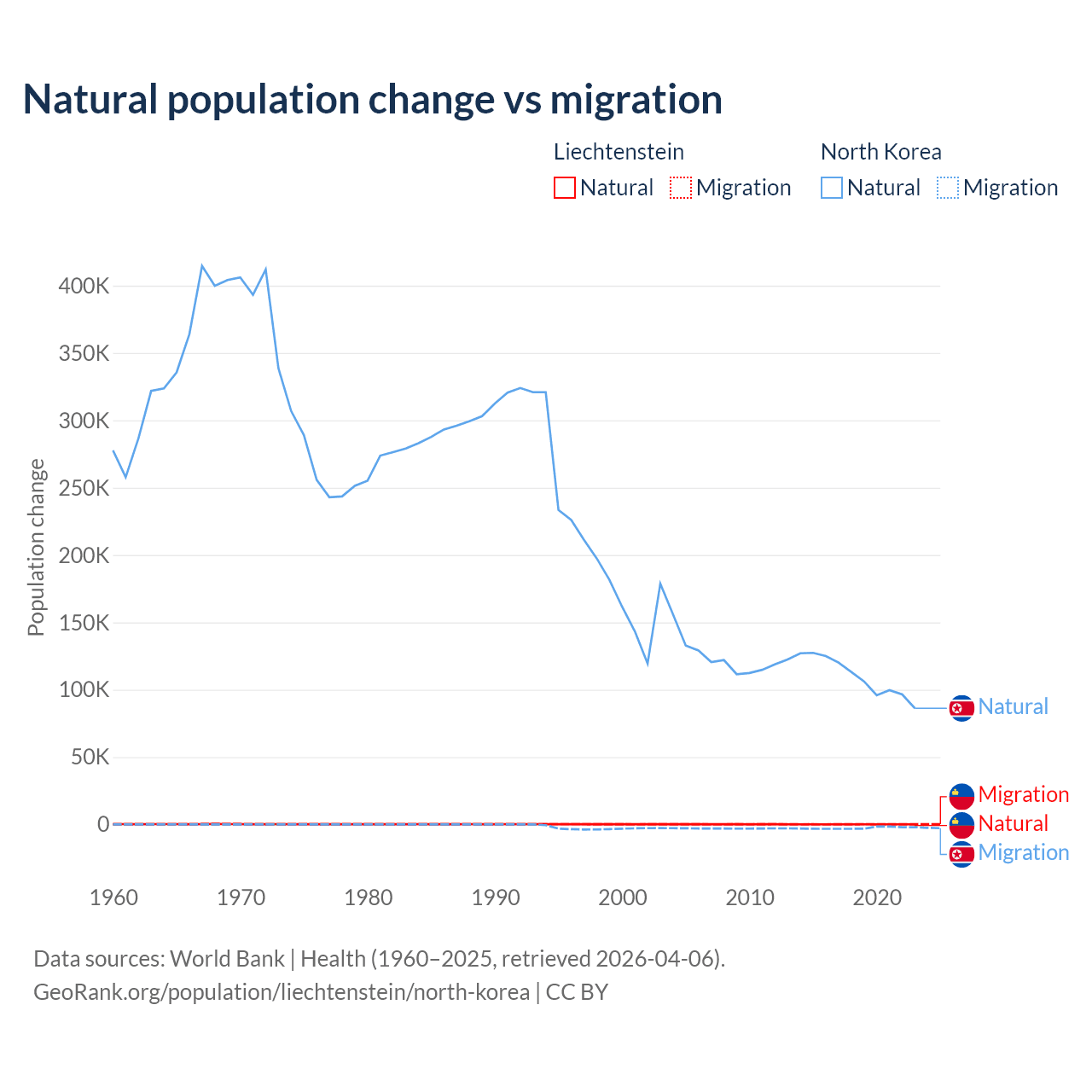 Over the last 10 years, 32.4% of the population change in Liechtenstein is from natural causes (a gain of 883 people) and 67.6% is from migration (a gain of 1,843 people). In North Korea 97.7% is from natural causes (a gain of 1,097,372 people) and 2.33% is from migration (a loss of 26,227 people).