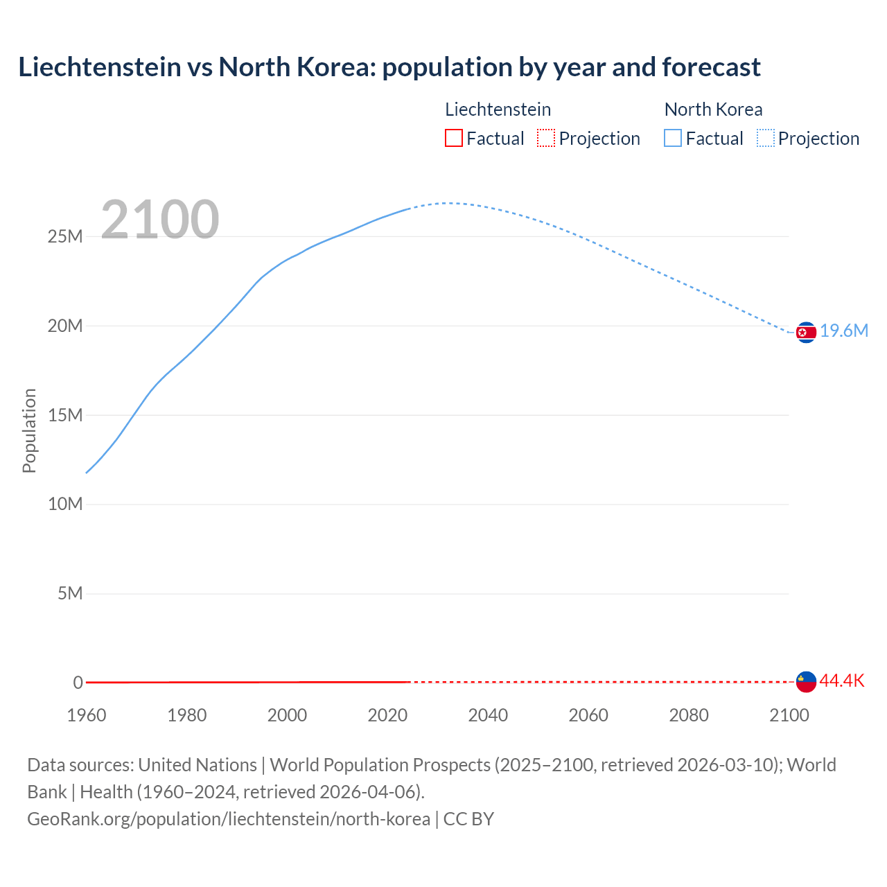 Liechtenstein vs North Korea: population by year and forecast