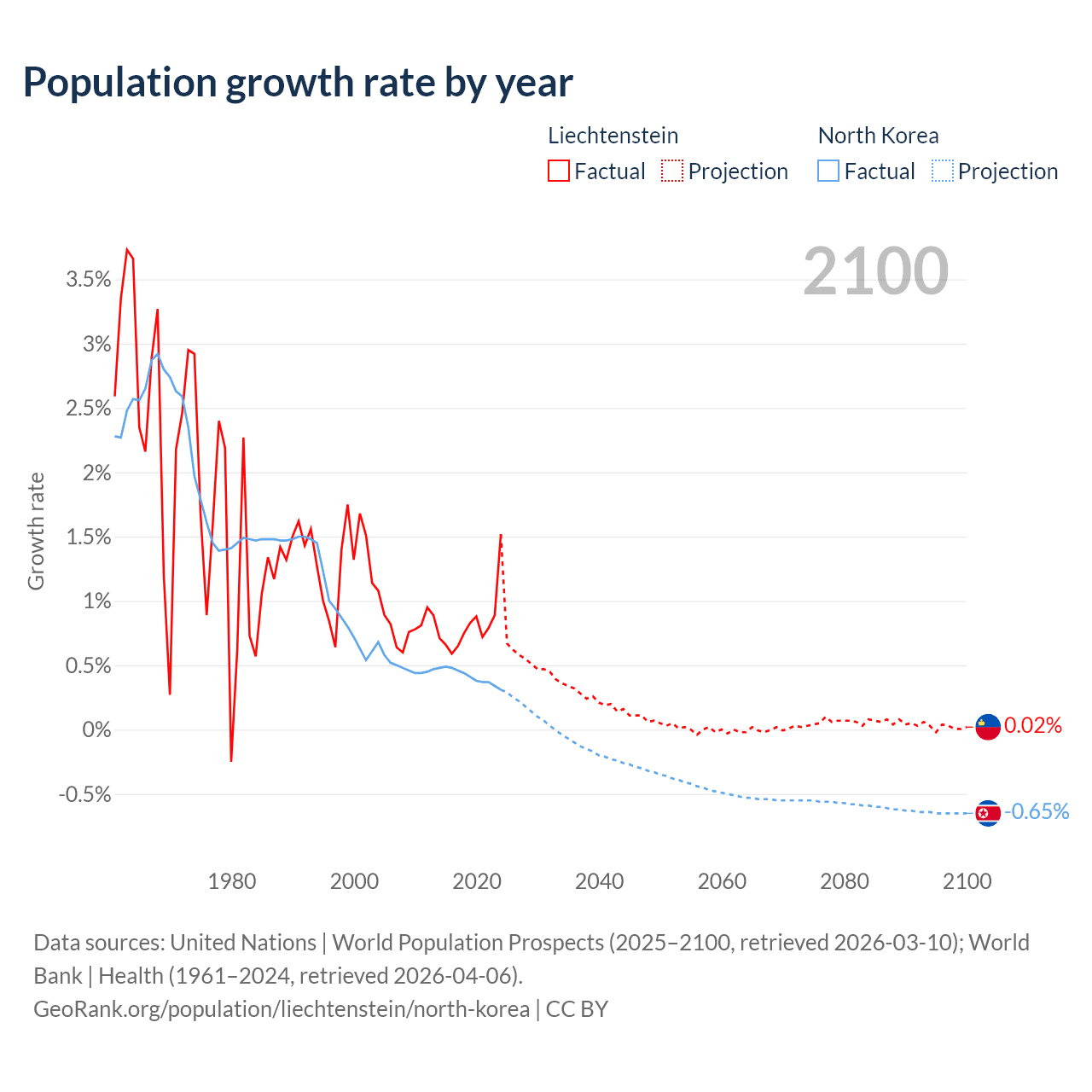 - For the last 10 years, Liechtenstein has had an average growth rate of +0.82% per year vs +0.41% in North Korea.