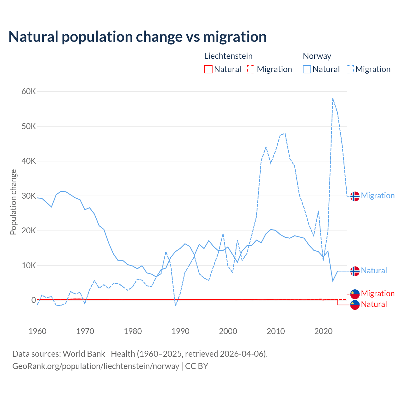 Over the last 10 years, 32.4% of the population change in Liechtenstein is from natural causes (a gain of 883 people) and 67.6% is from migration (a gain of 1,843 people). In Norway 31.3% is from natural causes (a gain of 138,699 people) and 68.7% is from migration (a gain of 303,945 people).
