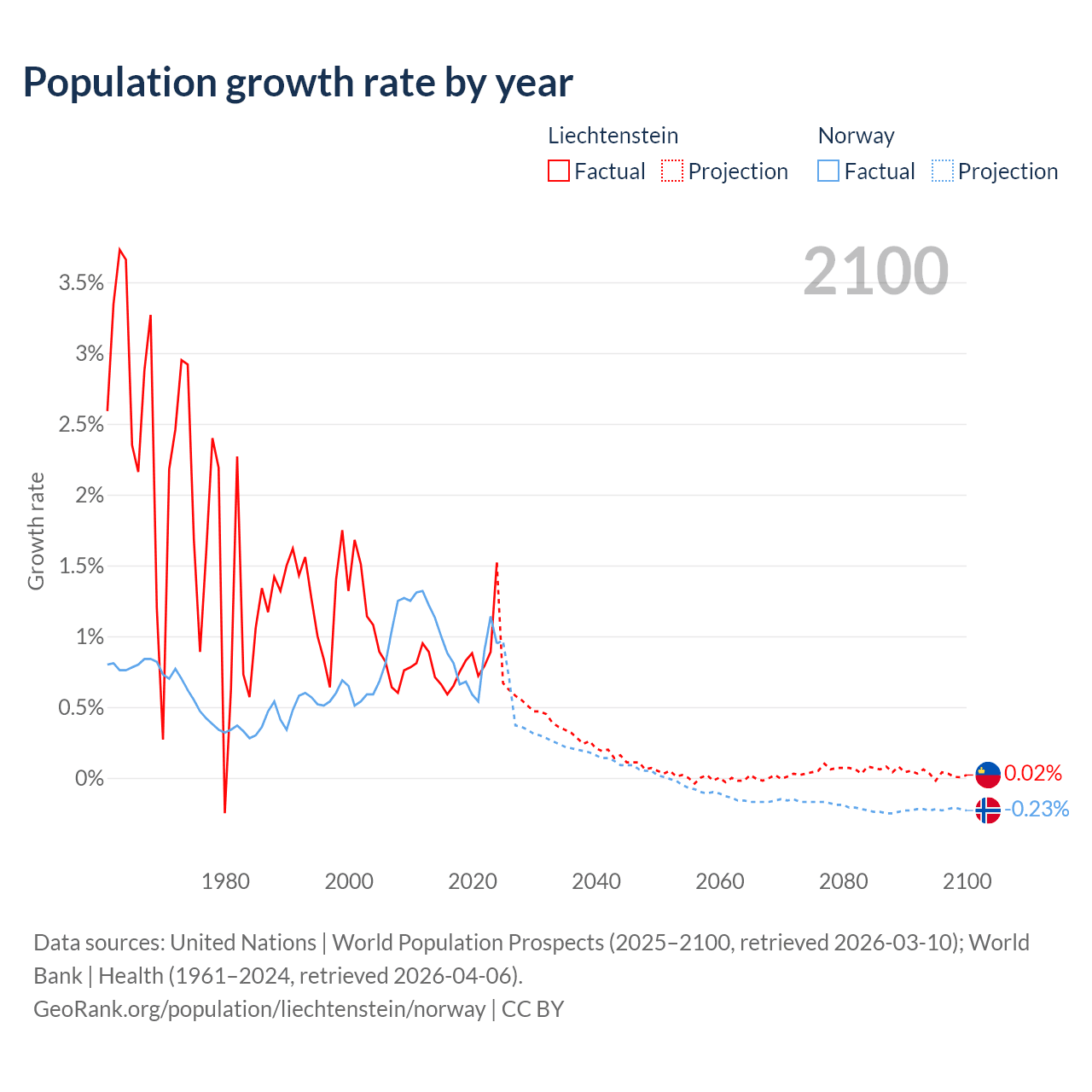 - For the last 10 years, Liechtenstein has had an average growth rate of +0.82% per year vs +0.85% in Norway.