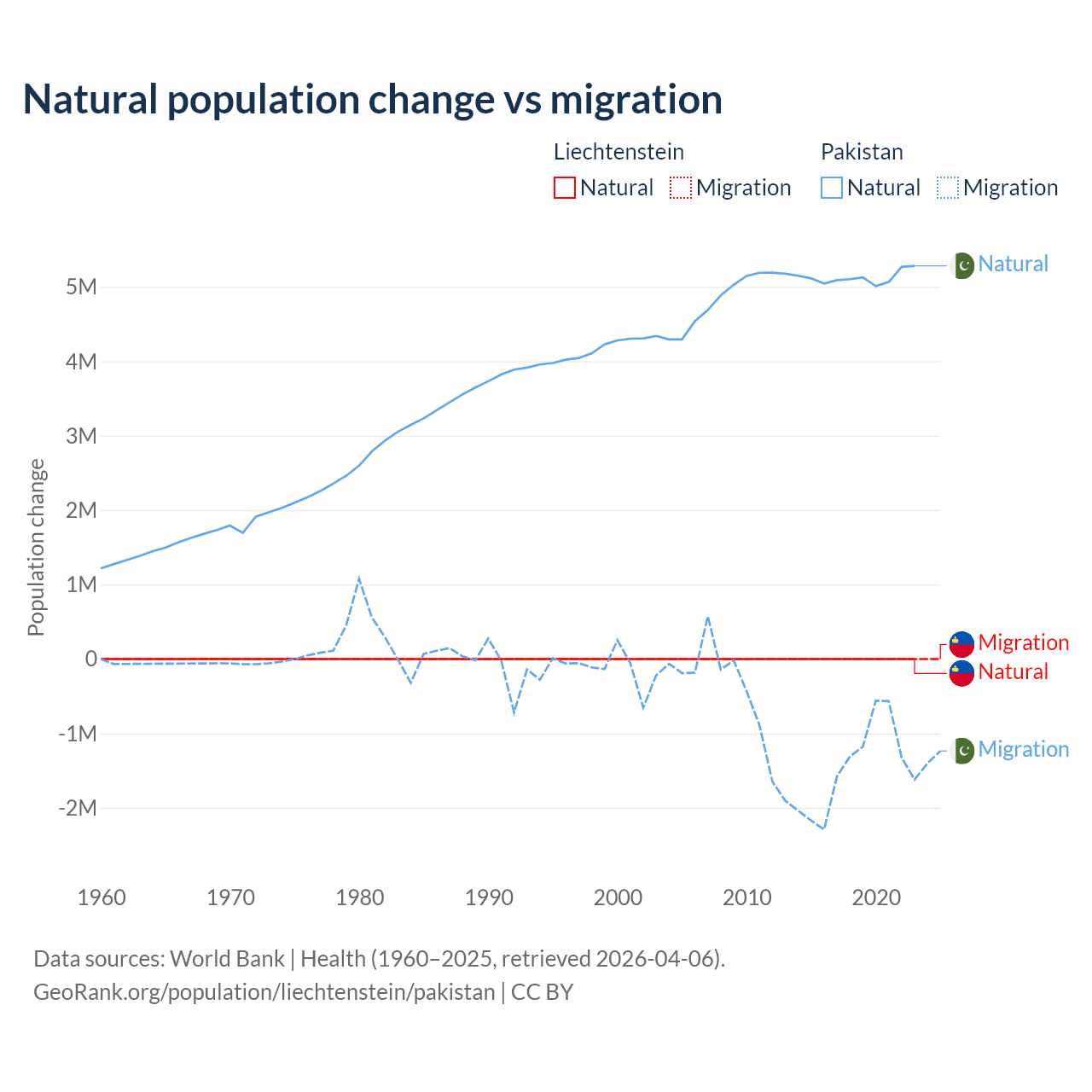 Over the last 10 years, 32.4% of the population change in Liechtenstein is from natural causes (a gain of 883 people) and 67.6% is from migration (a gain of 1,843 people). In Pakistan 77.8% is from natural causes (a gain of 51,255,404 people) and 22.2% is from migration (a loss of 14,629,055 people).