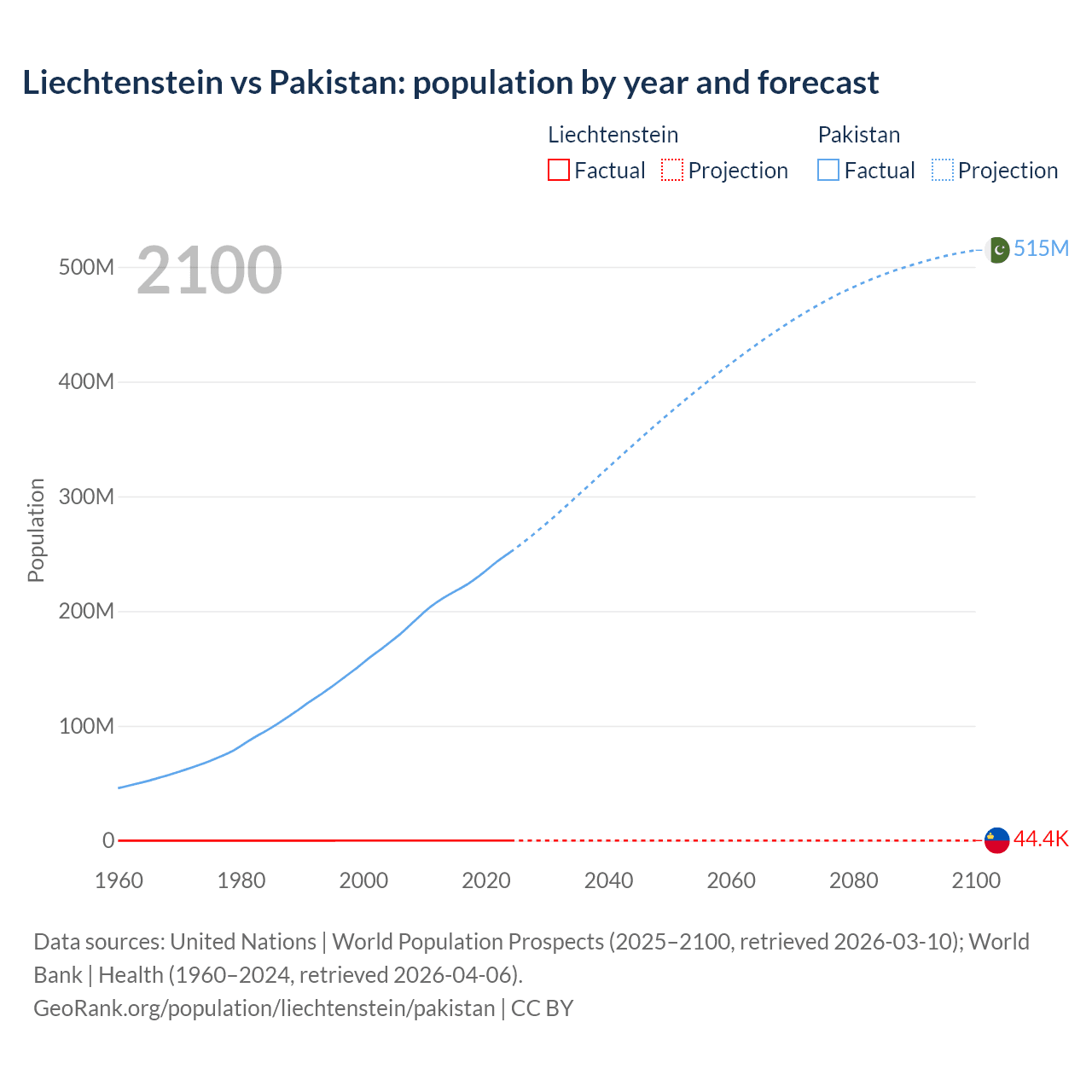 The latest officially reported population of Liechtenstein was 40,450 in 2024 vs 251,269,164 people in Pakistan in 2024. In 2026, based on the adjusted UN estimation, the current Liechtenstein's population is 41,038 people compared to 260,356,147 in Pakistan.