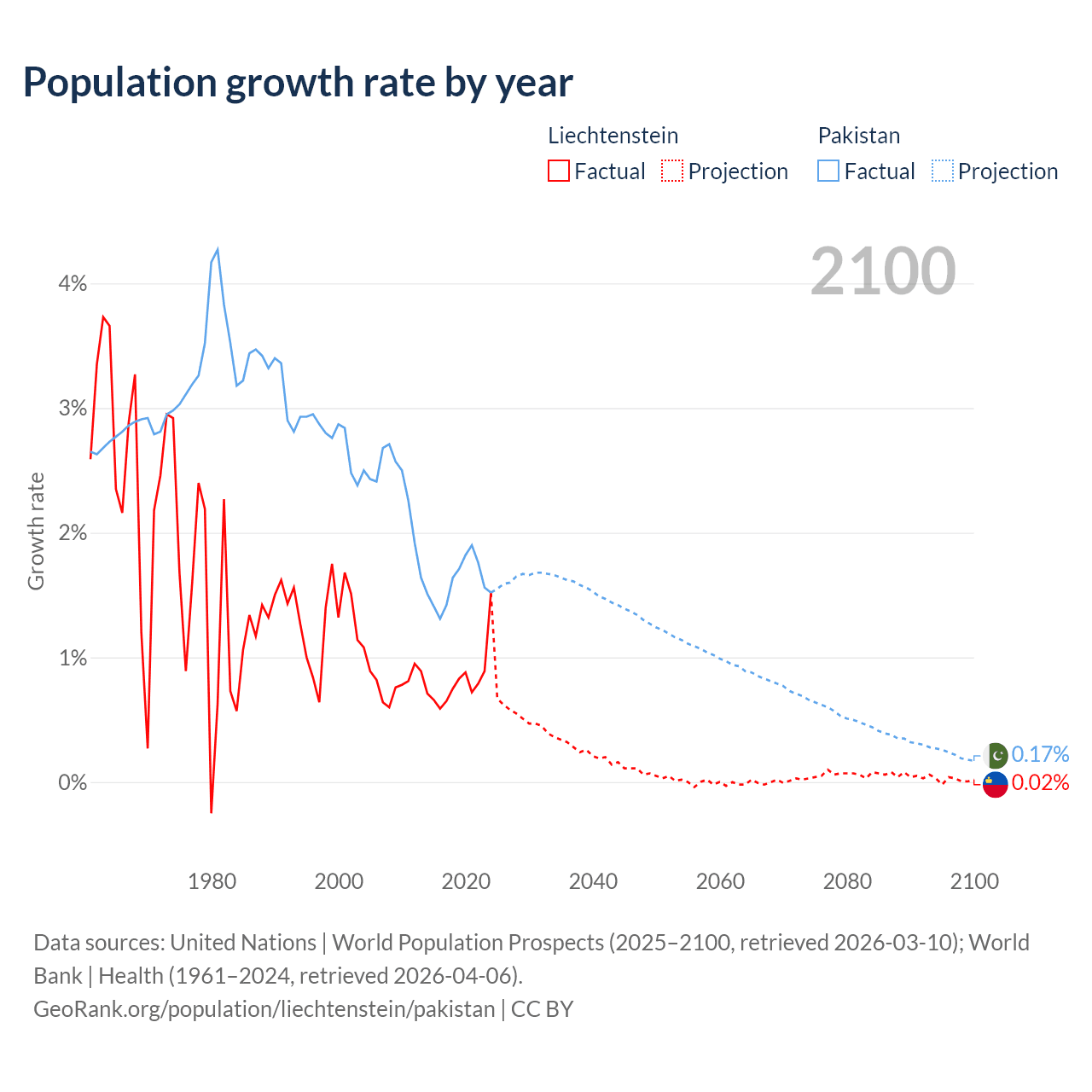 - For the last 10 years, Liechtenstein has had an average growth rate of +0.82% per year vs +1.6% in Pakistan.