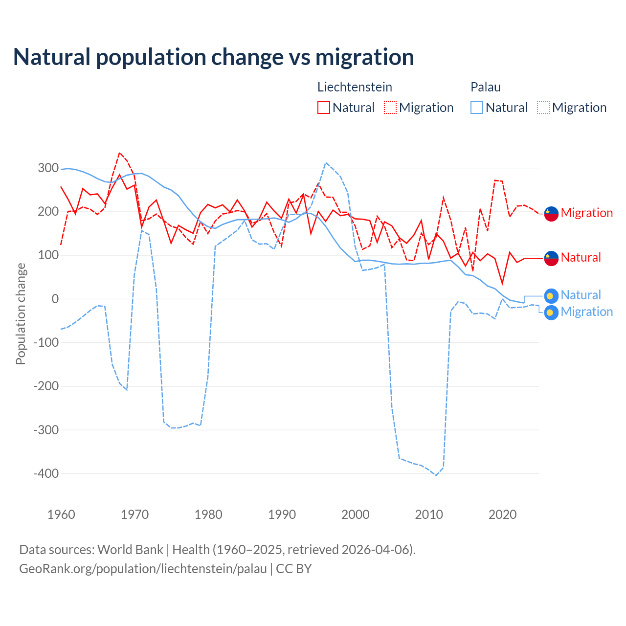 Over the last 10 years, 32.4% of the population change in Liechtenstein is from natural causes (a gain of 883 people) and 67.6% is from migration (a gain of 1,843 people). In Palau 53.8% is from natural causes (a gain of 264 people) and 46.2% is from migration (a loss of 227 people).