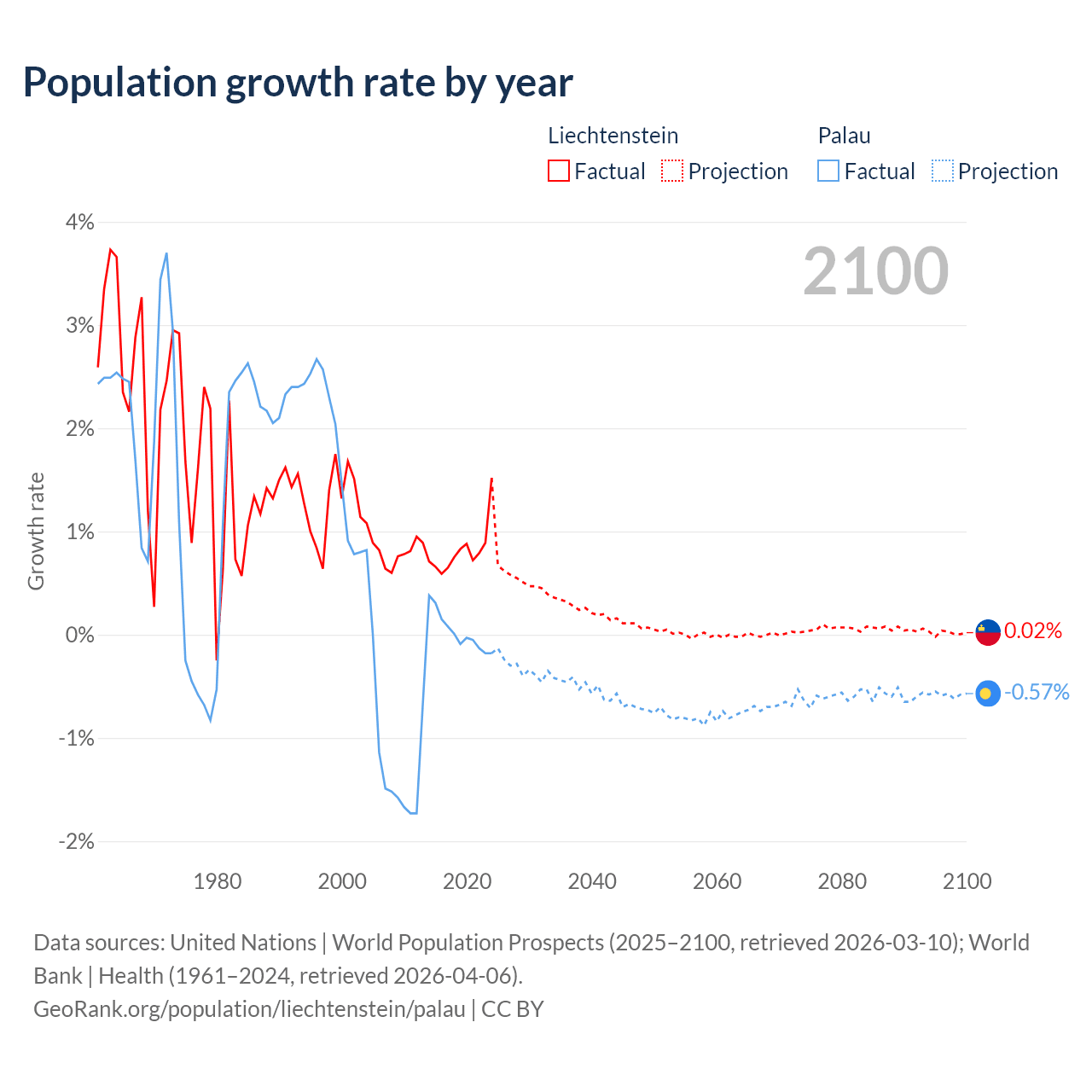 - For the last 10 years, Liechtenstein has had an average growth rate of +0.82% per year vs +0.02% in Palau.