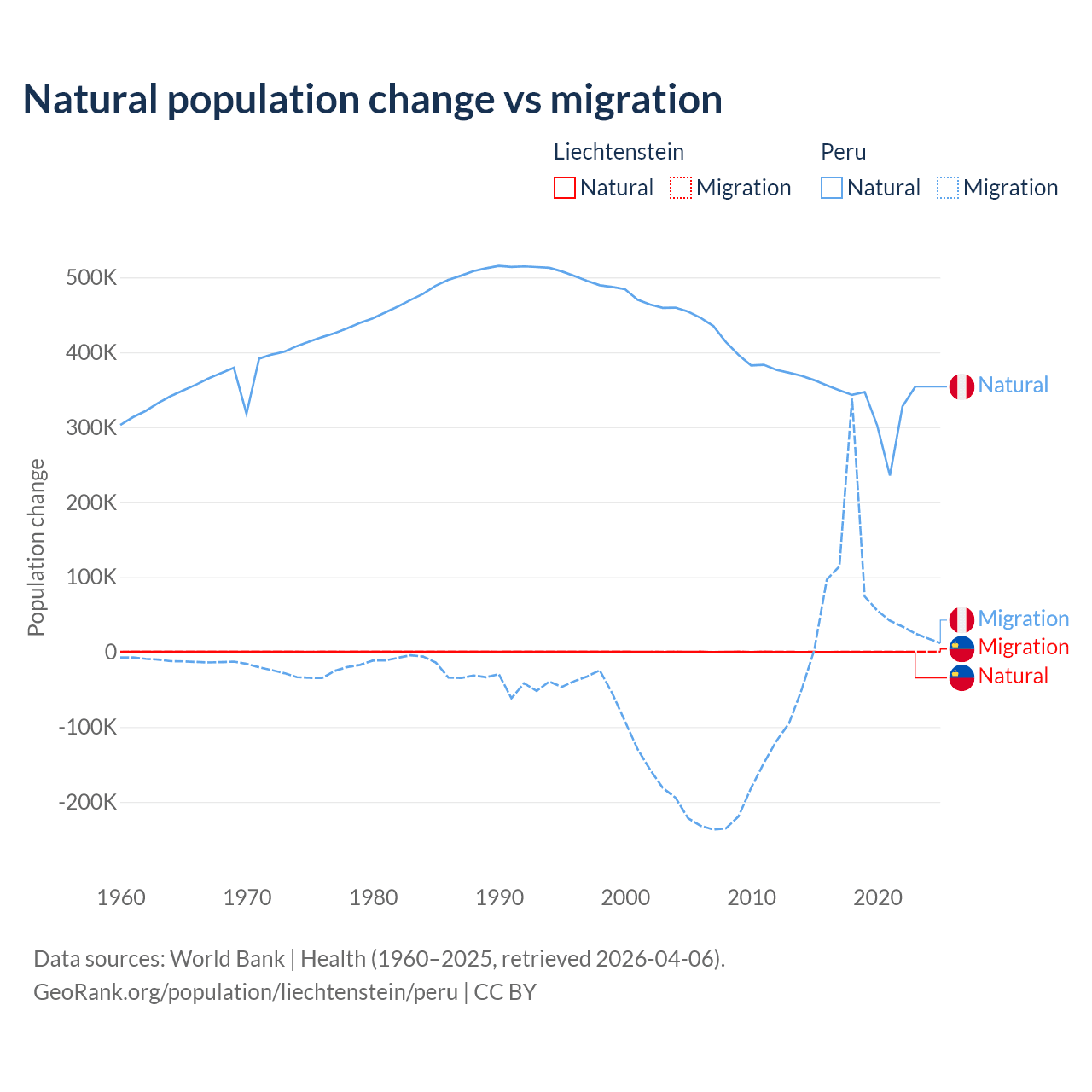 Over the last 10 years, 32.4% of the population change in Liechtenstein is from natural causes (a gain of 883 people) and 67.6% is from migration (a gain of 1,843 people). In Peru 82% is from natural causes (a gain of 3,345,822 people) and 18% is from migration (a gain of 732,505 people).
