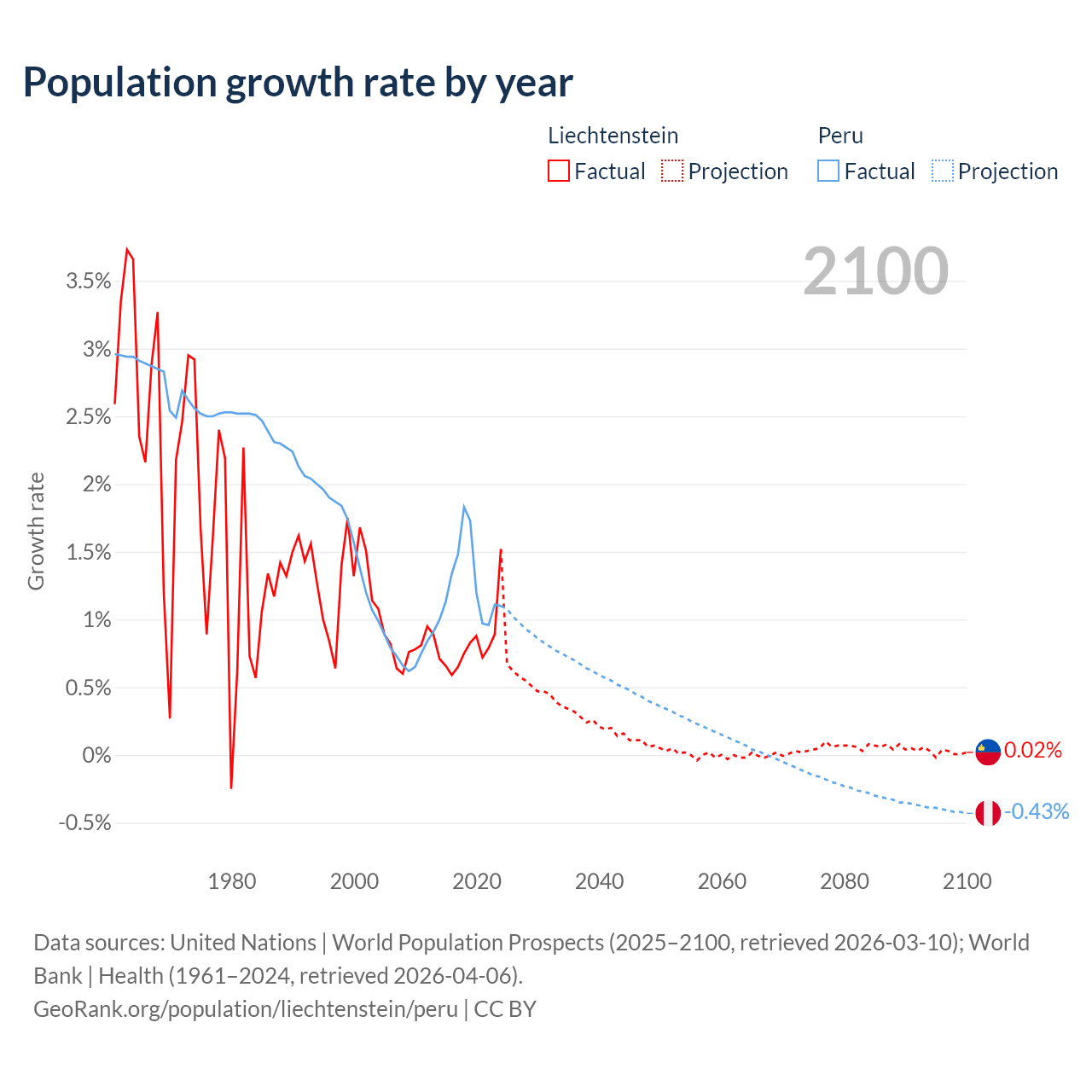- For the last 10 years, Liechtenstein has had an average growth rate of +0.82% per year vs +1.26% in Peru.