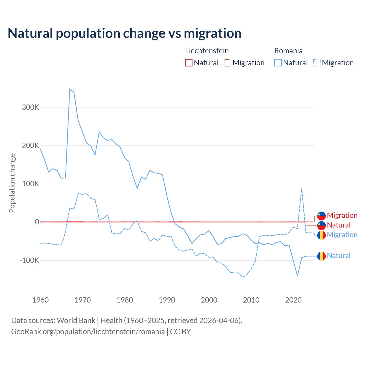 Over the last 10 years, 32.4% of the population change in Liechtenstein is from natural causes (a gain of 883 people) and 67.6% is from migration (a gain of 1,843 people). In Romania 82% is from natural causes (a loss of 766,295 people) and 18% is from migration (a loss of 167,917 people).