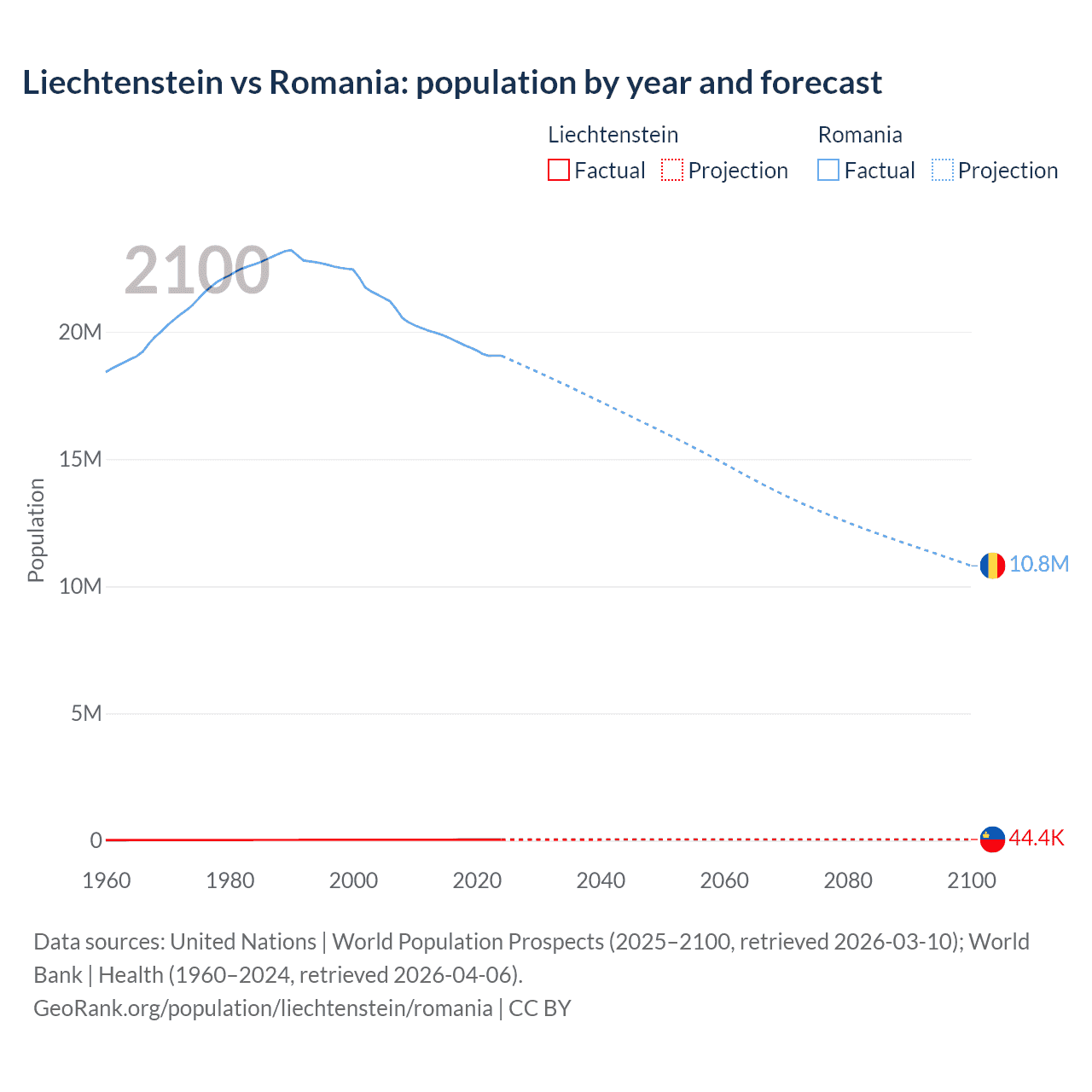The latest officially reported population of Liechtenstein was 40,450 in 2024 vs 19,051,804 people in Romania in 2024. In 2026, based on the adjusted UN estimation, the current Liechtenstein's population is 41,038 people compared to 18,839,108 in Romania.