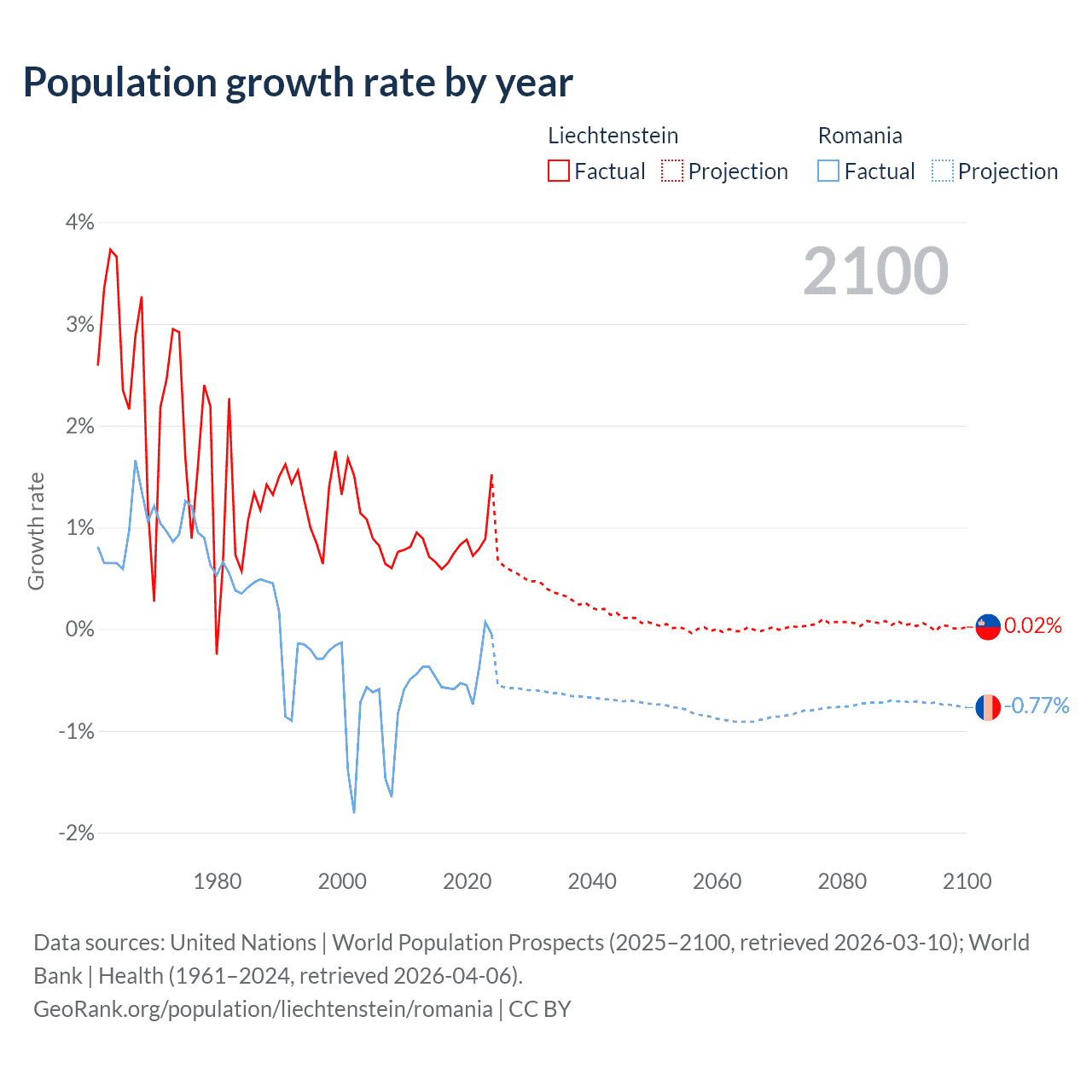 - For the last 10 years, Liechtenstein has had an average growth rate of +0.82% per year vs -0.43% in Romania.
