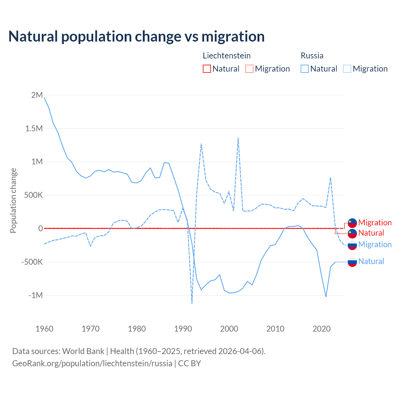 Over the last 10 years, 32.4% of the population change in Liechtenstein is from natural causes (a gain of 883 people) and 67.6% is from migration (a gain of 1,843 people). In Russia 48.6% is from natural causes (a loss of 3,416,377 people) and 51.4% is from migration (a gain of 3,611,826 people).
