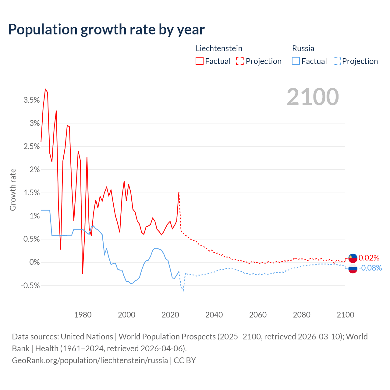 - For the last 10 years, Liechtenstein has had an average growth rate of +0.82% per year vs -0.02% in Russia.