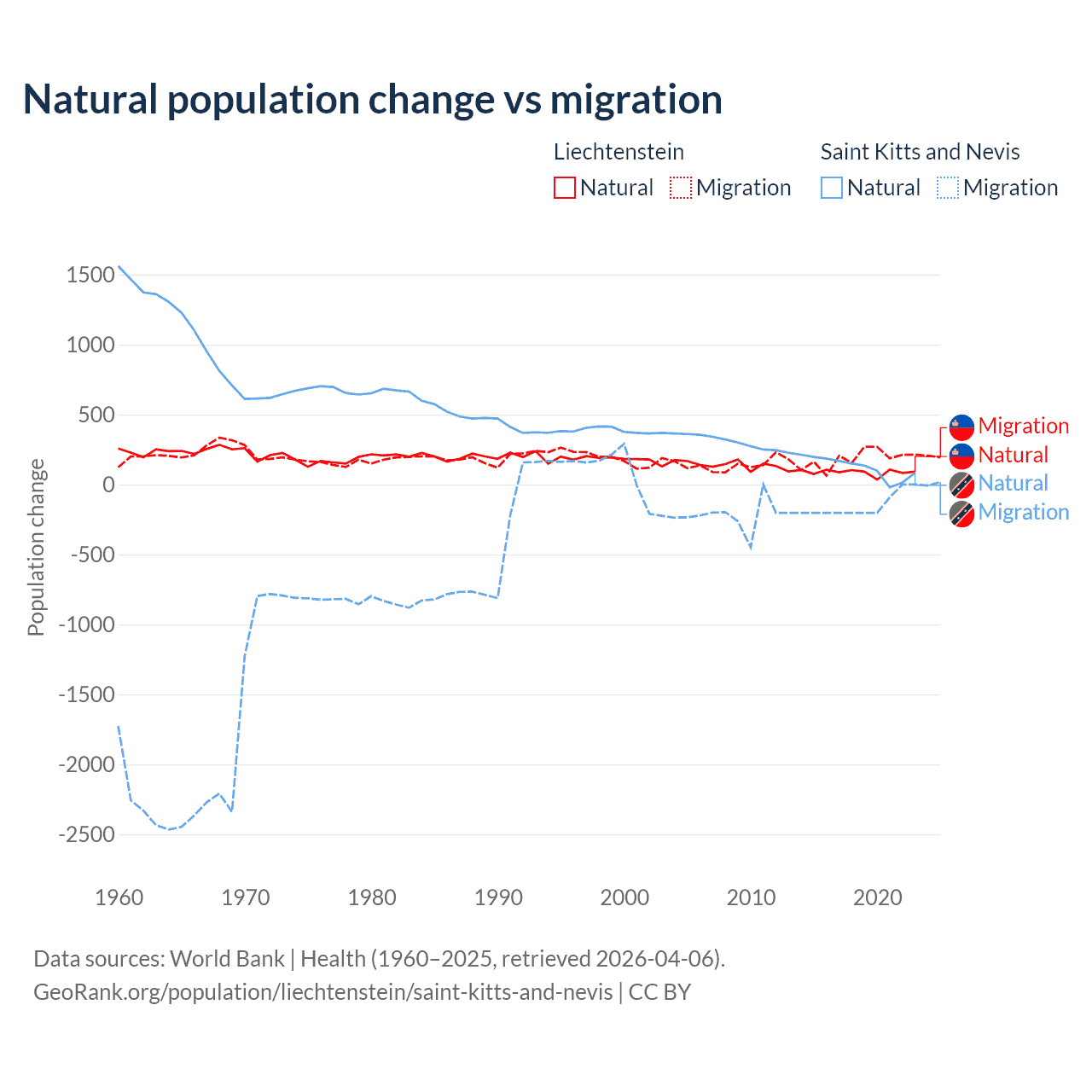 Over the last 10 years, 32.4% of the population change in Liechtenstein is from natural causes (a gain of 883 people) and 67.6% is from migration (a gain of 1,843 people). In Saint Kitts and Nevis 44.9% is from natural causes (a gain of 1,225 people) and 55.1% is from migration (a loss of 1,506 people).