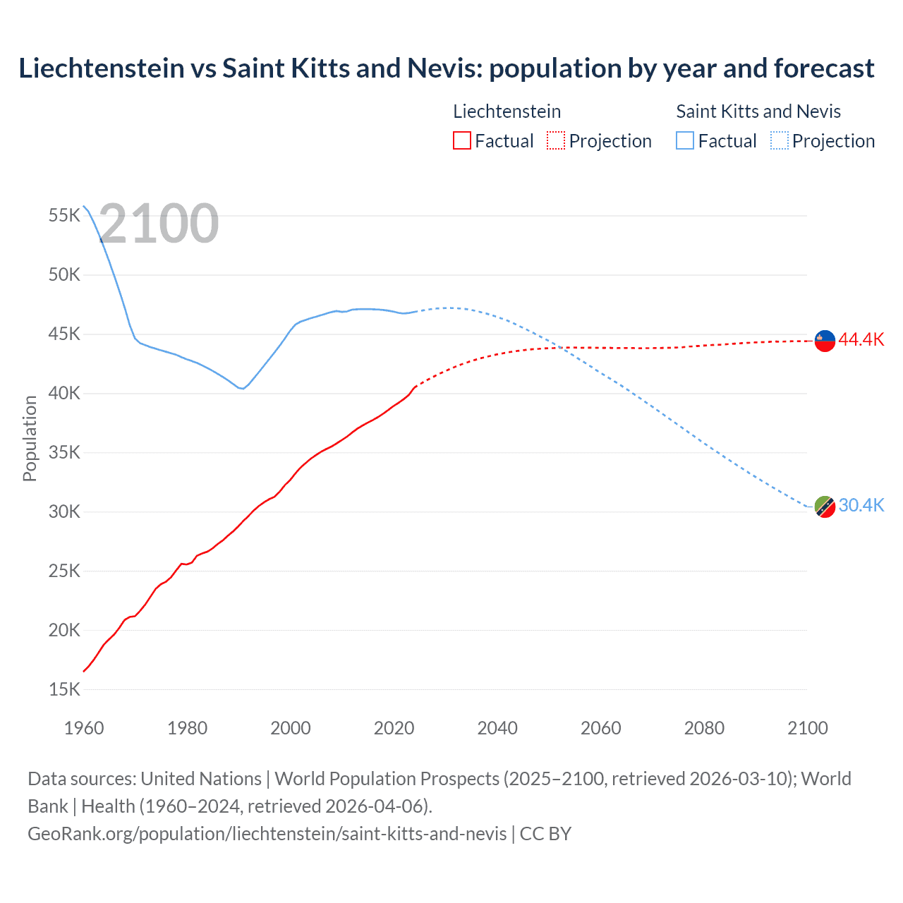 The latest officially reported population of Liechtenstein was 40,450 in 2024 vs 46,843 people in Saint Kitts and Nevis in 2024. In 2026, based on the adjusted UN estimation, the current Liechtenstein's population is 41,038 people compared to 47,017 in Saint Kitts and Nevis.