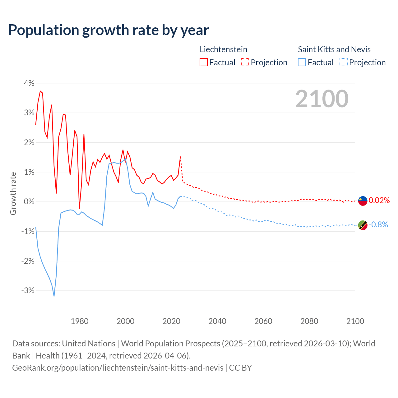 - For the last 10 years, Liechtenstein has had an average growth rate of +0.82% per year vs -0.04% in Saint Kitts and Nevis.