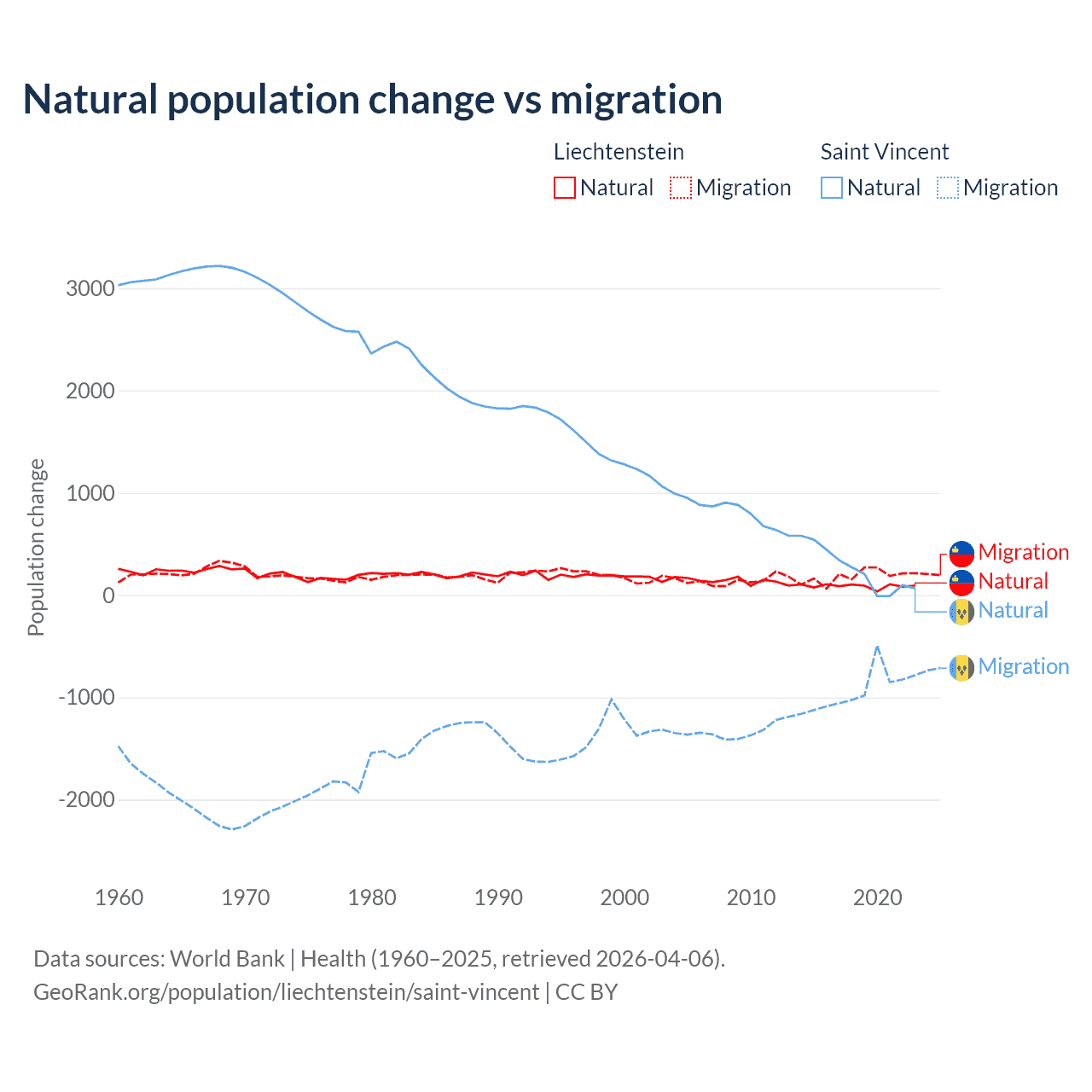 Over the last 10 years, 32.4% of the population change in Liechtenstein is from natural causes (a gain of 883 people) and 67.6% is from migration (a gain of 1,843 people). In Saint Vincent 21.2% is from natural causes (a gain of 2,525 people) and 78.8% is from migration (a loss of 9,393 people).