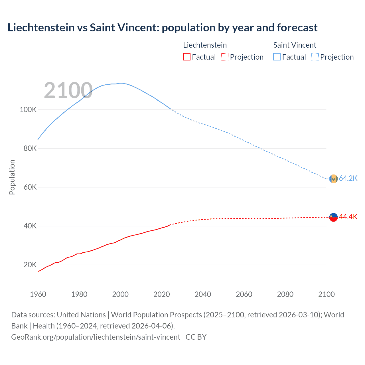 The latest officially reported population of Liechtenstein was 40,450 in 2024 vs 100,616 people in Saint Vincent in 2024. In 2026, based on the adjusted UN estimation, the current Liechtenstein's population is 41,038 people compared to 99,237 in Saint Vincent.