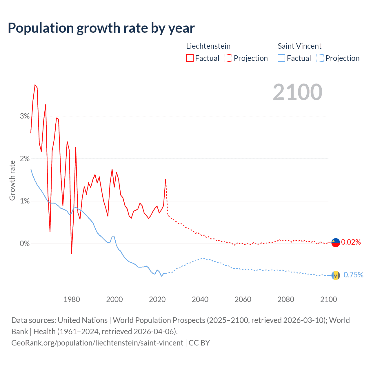 - For the last 10 years, Liechtenstein has had an average growth rate of +0.82% per year vs -0.65% in Saint Vincent.